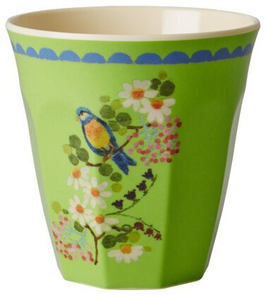 Det mest utmärkande är den lilla fågeln som vilar på en av grenarna i motivet. Fågeln är omsorgsfullt detaljerad, med fjädrar i nyanser av blått och gult, kompletterat med en dämpad orange nyans på bröstet. Denna fina detaljering ger en känsla av rörelse och liv åt designen. Muggen, tillverkad för att både vara funktionell och dekorativ, kan enkelt bli en favorit i kökets servis.