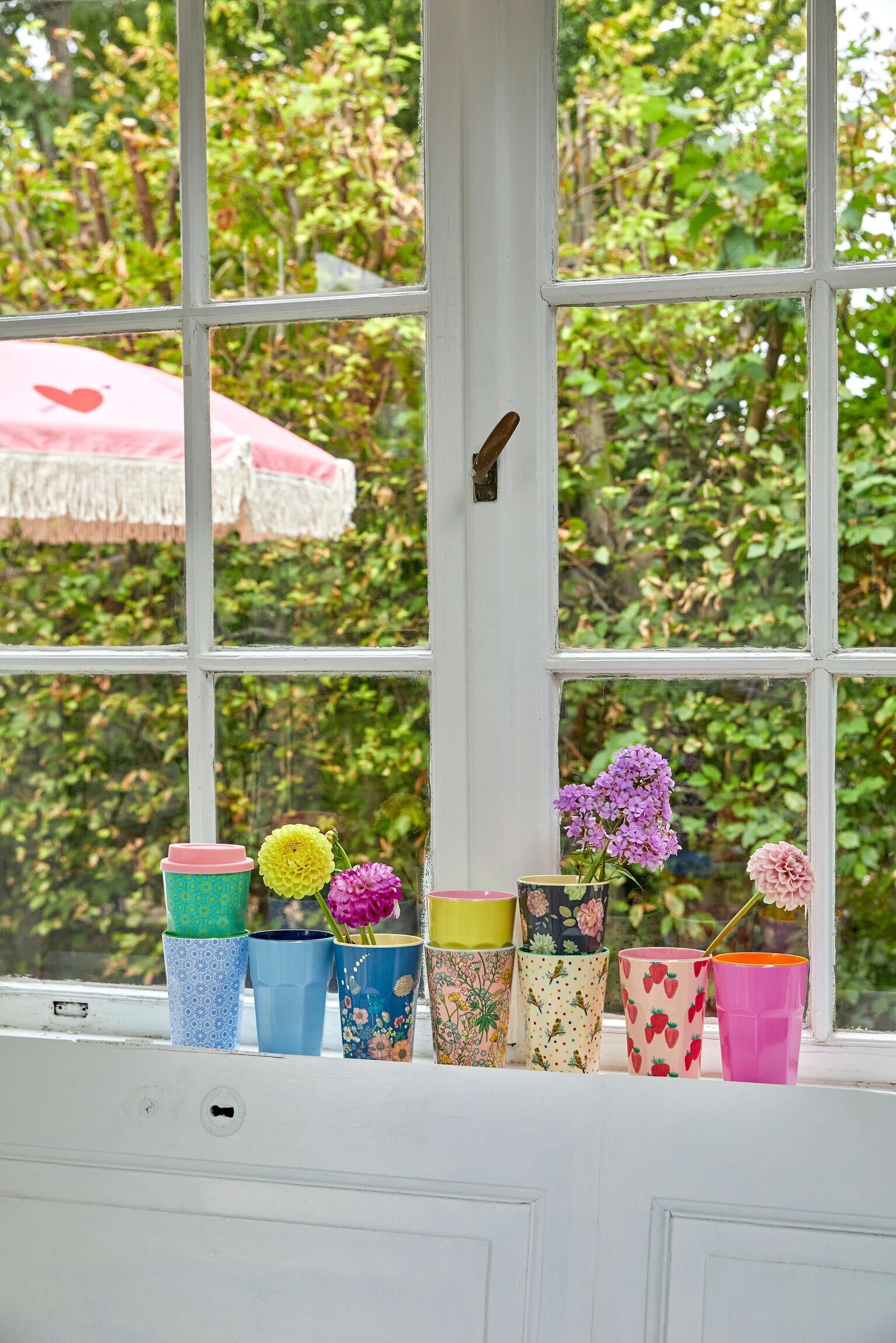 Fönsterbrädan är belägen i ett ljust rum med en vitmålad fönsterkarm som ramar in de olika mönstrade och enfärgade muggarna. Muggarna är arrangerade i en varierad färgpalett som inkluderar nyanser av blått, rosa, gult och grönt samt olika mönster såsom blommor och geometriska former. Denna variation framhäver Rice designrikedom och bidrar till en uppfriskande atmosfär.