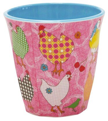 Mönstrad mugg i rosa nyans med färgglada hönor. Muggarna finns i flera färger och mönster som är fina att kombinera tillsammans. Denna mugg passar till både kalaset, festen, picnicen och framförallt hemma till barnen. Håller i alla lägen, inget glasskross efter en tappad mugg. Rymmer ca 2,5 dl. Tål maskindisk men inte micro. Denna produkt är godkänd för livsmedel. Mått: 9 cm i diameter x höjd 9 cm.