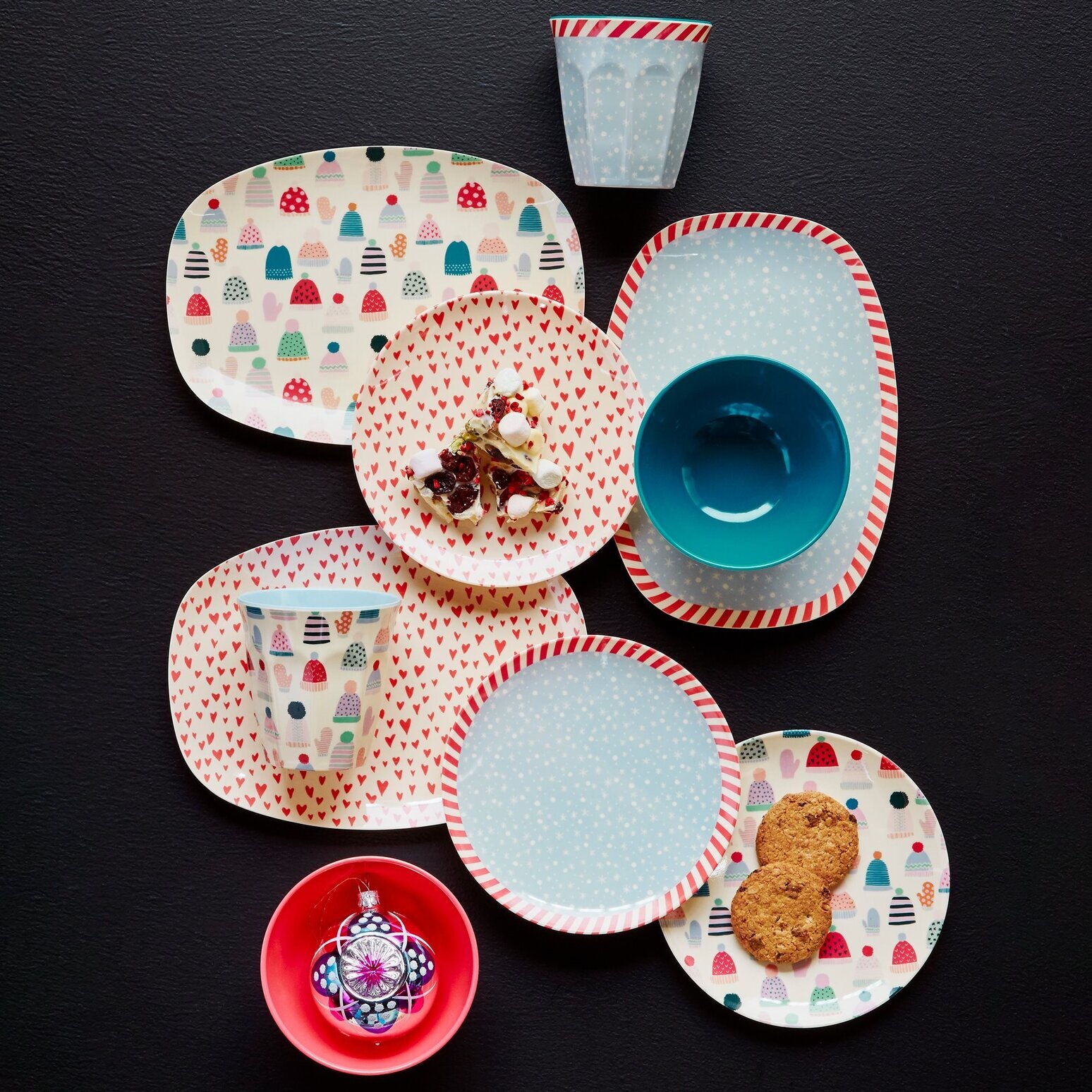 Därtill finns det runda tallrikar och små skålar med olika dekorer. En av tallrikarna har ett mönster av små vita prickar mot en himmelsblå bakgrund, medan en annan dekoreras med röda hjärtan tätt placerade på en krämfärgad yta, vilket förstärker den varma atmosfären. Skålarna, en i en djup blå nyans och en i en livlig röd, ligger elegant placerade och i den röda skymtar vi en glittrande juldekoration.