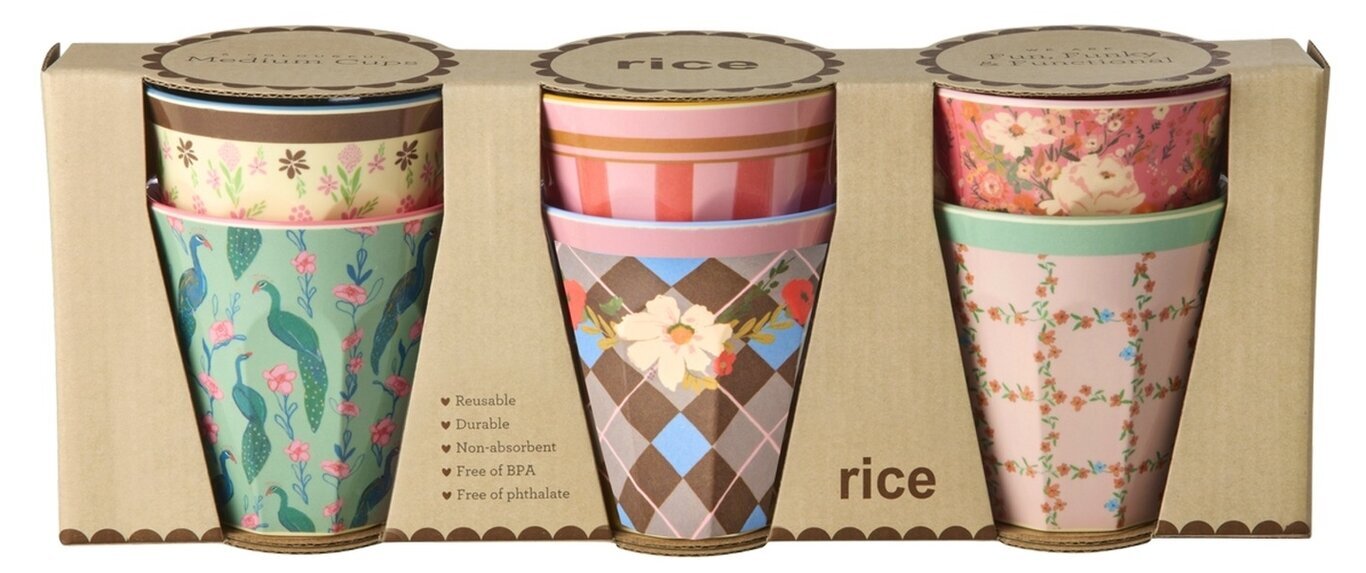 Gör varje måltid lite roligare med dessa färgstarka melaminmuggar från Rice. Setet innehåller sex olika muggar i vackra, lekfulla mönster – allt från blommigt och rutigt till fantasifulla fåglar. Muggarna kommer i en dekorativ presentbox och passar lika bra som gåva som till det egna köksskåpet.