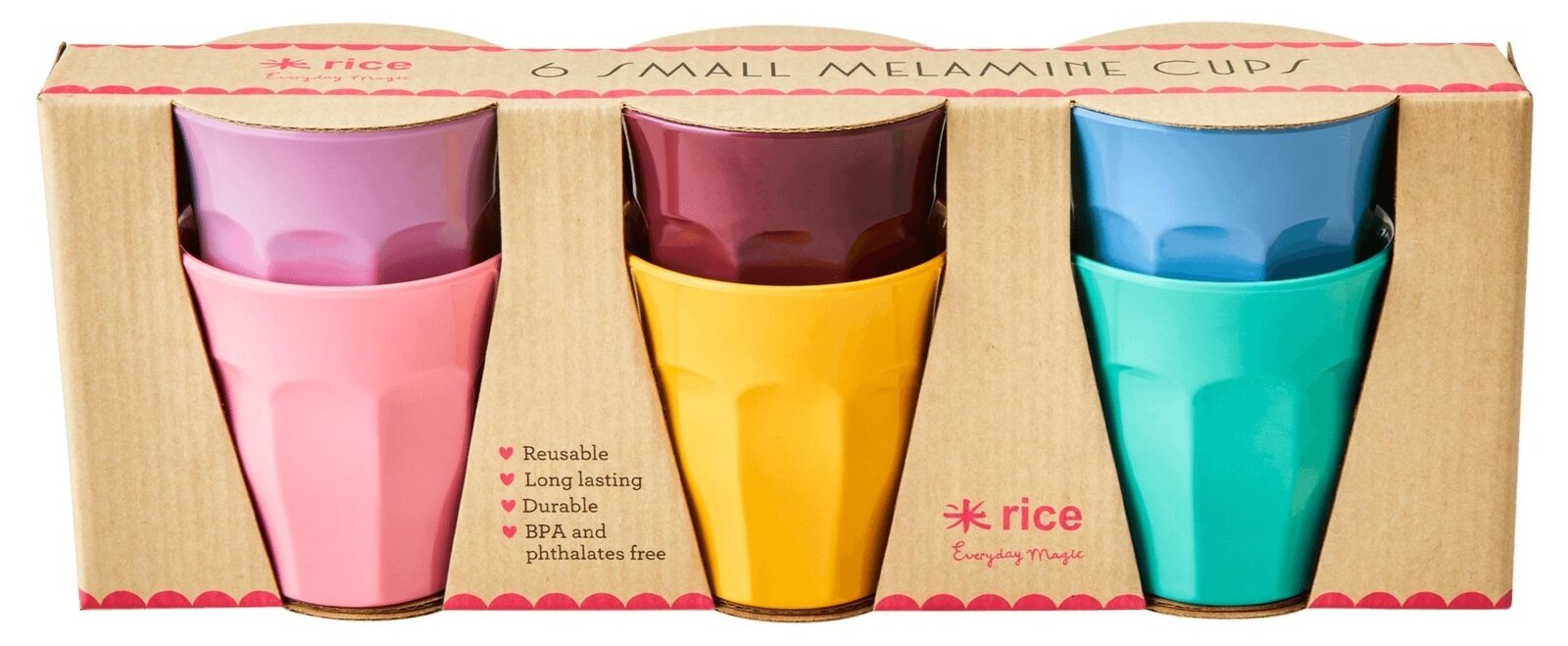 Melaminmuggar i set om 6 stycken. Passar till både kalaset, festen, picknicken och framförallt hemma till barnen. Håller i alla lägen, inget glasskross efter en tappad mugg. Tål maskindisk men ska inte användas i micro.