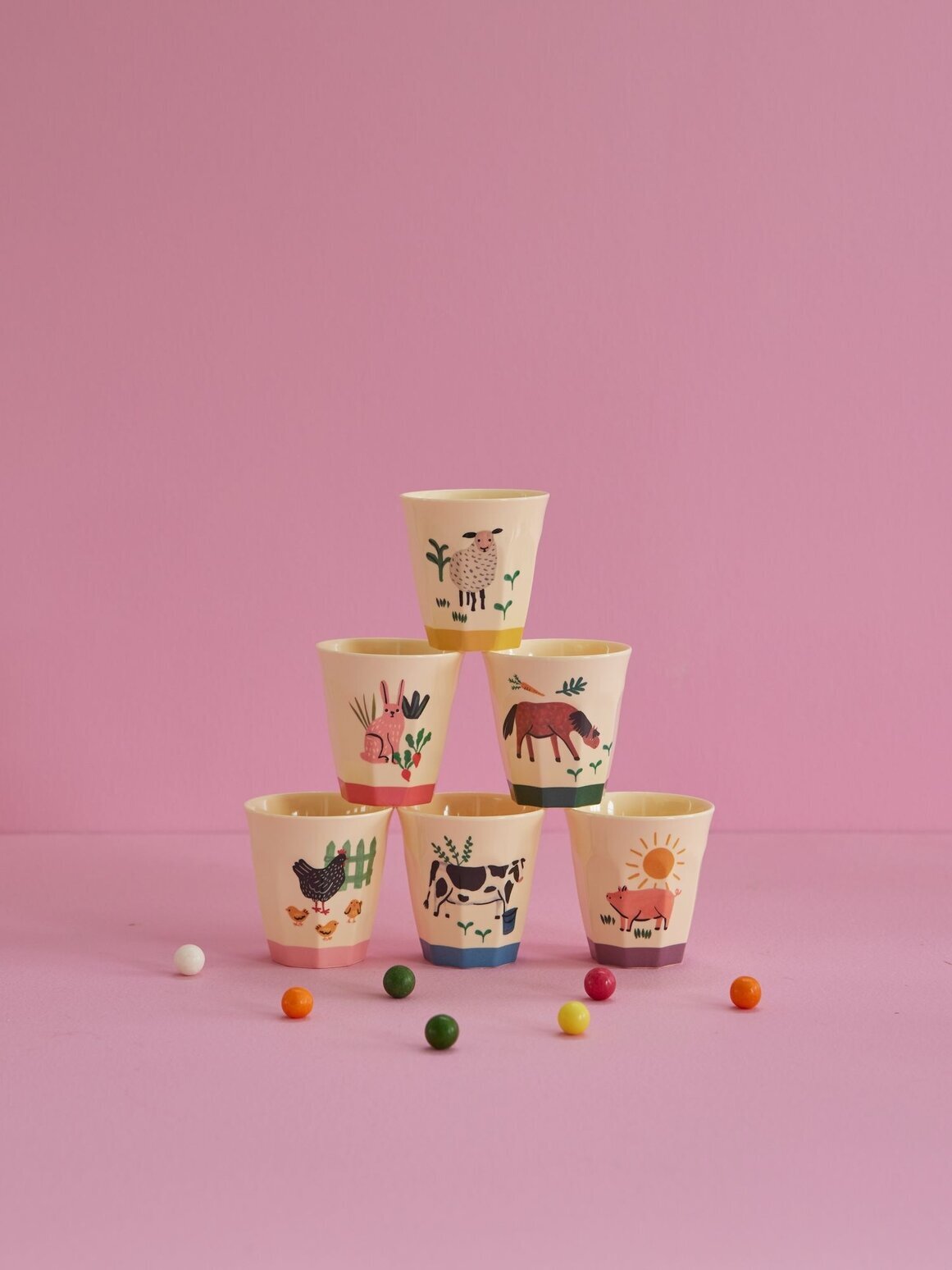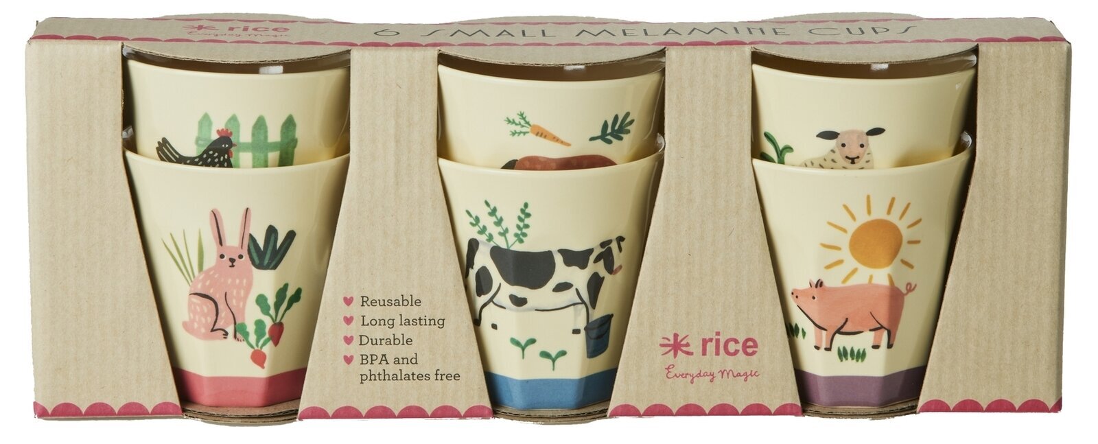 Melaminmuggar i set om 6 stycken. Passar till både kalaset, festen, picknicken och framförallt hemma till barnen. Håller i alla lägen, inget glasskross efter en tappad mugg. Tål maskindisk men ska inte användas i micro.