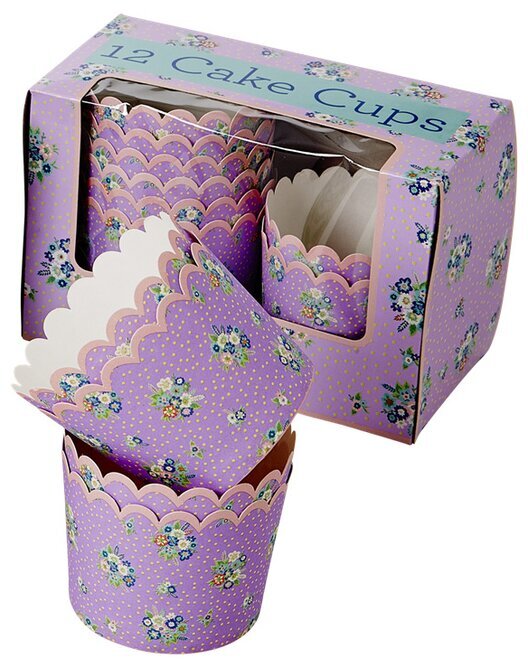 Förpackningen är också iögonfallande. Den är designad i samma lila nyans som formarna, vilket skapar en harmonisk enhetskänsla. Den har ett fönster i plast på framsidan som gör att man kan se de noggrant staplade formarna inuti, vilket ger ett smakprov på produkten utan att behöva öppna lådan. Texten "12 Cake Cups" är tryckt på förpackningen, precis ovanför fönstret, och ger en tydlig indikation på vad produkten innehåller.