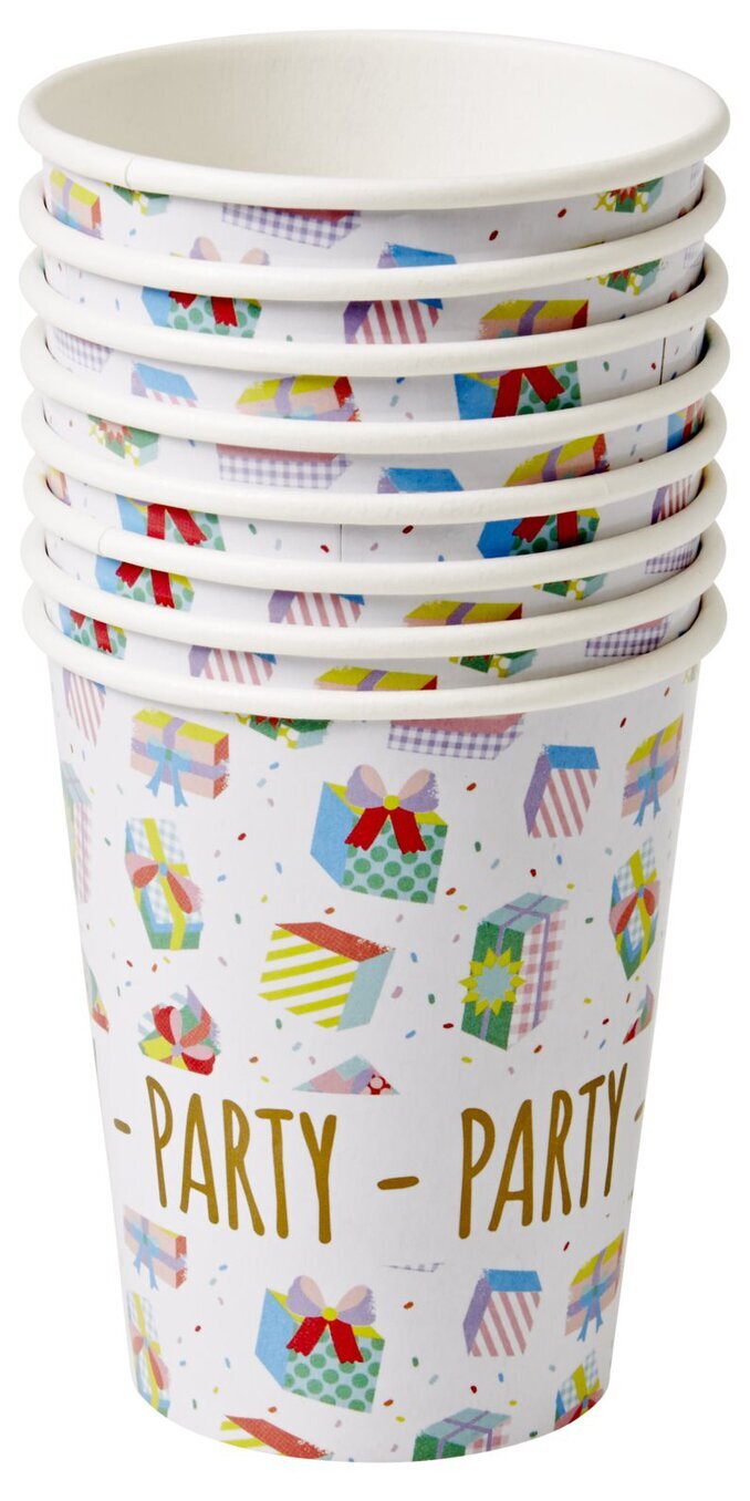 Förpackning innehållande 8 stycken kalasmuggar i papp med motiv av färgglada paket samt texten Party. Mått: Ø 7 x 9 cm. Läs mer