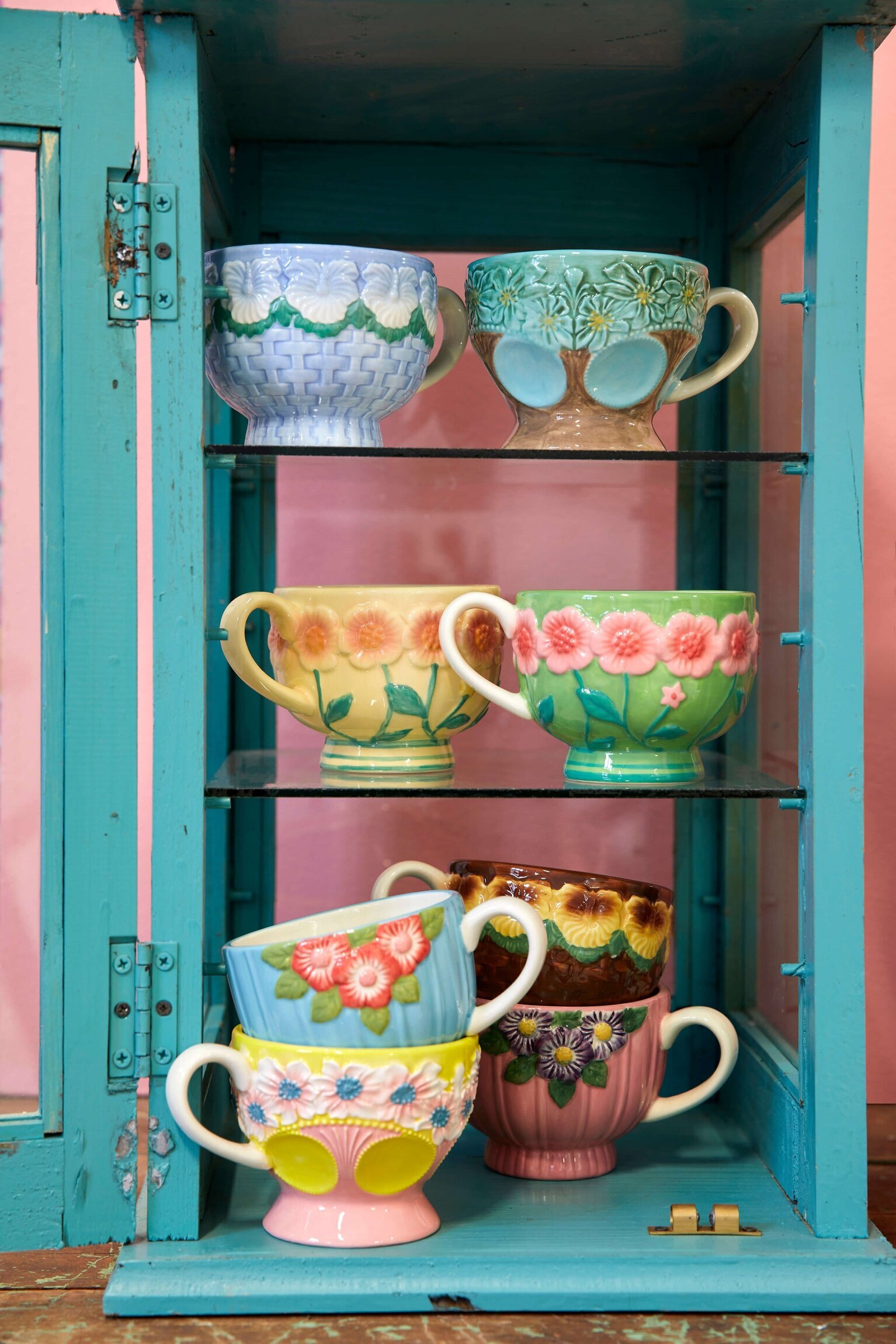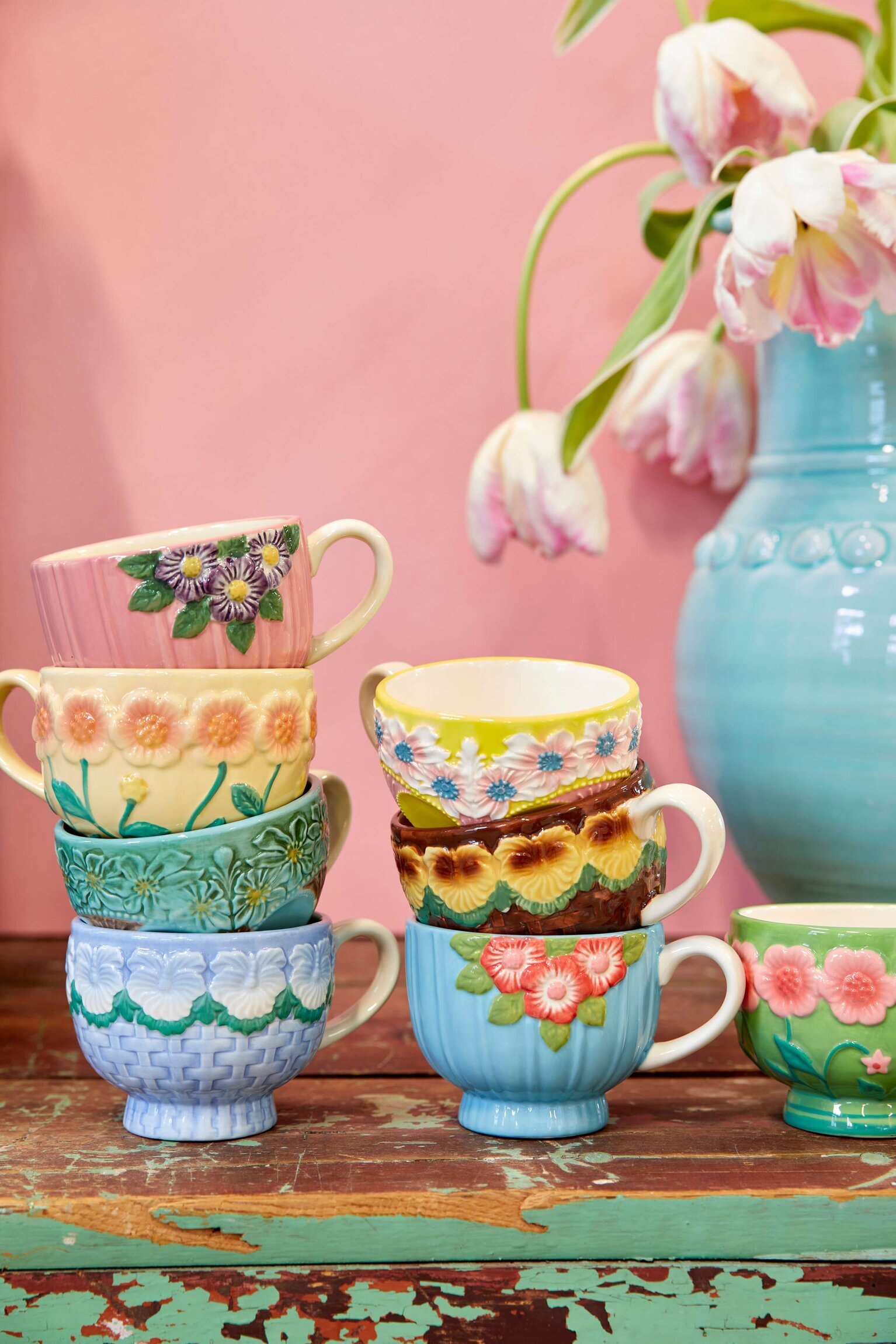 Keramikmugg med vackra blomsterdetaljer, finns i flera olika färger. Kan diskas i diskmaskin.
