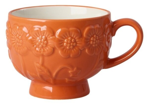 En färgstark keramikmugg från Rice i en varm orange nyans med vackert blommönster i relief. Den rundade formen och lilla foten ger muggen ett charmigt och personligt uttryck som lyfter varje fikastund.