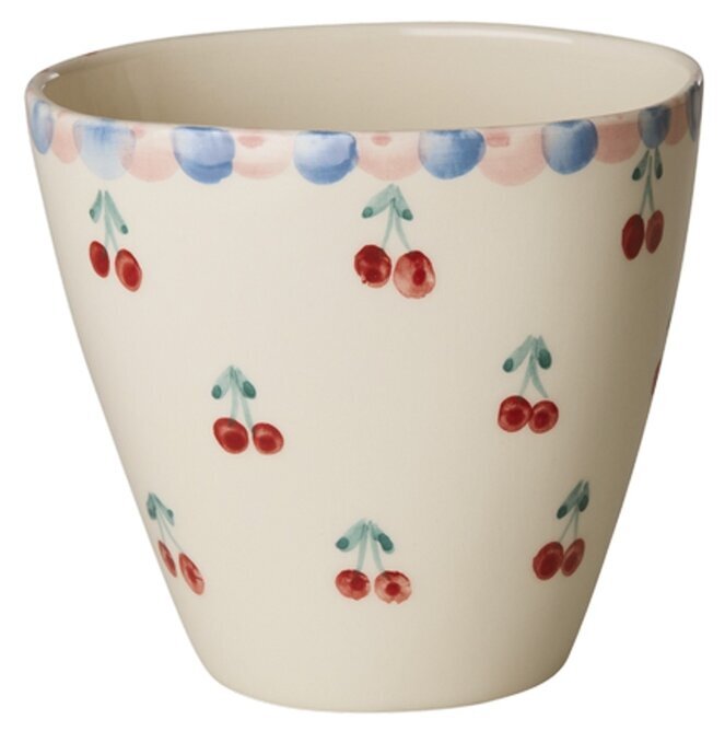 Den här charmiga koppen från Rice är som ett litet lyckopiller i köksskåpet. Med sina handmålade körsbär och den lekfulla bården i blått och rosa sprider den glädje – oavsett om du dricker morgonkaffet i stillhet eller bjuder en vän på te. Den är tillverkad för hand i Portugal och varje kopp är unik, med små variationer som bara gör den ännu finare. En kär favorit att använda om och om igen.
