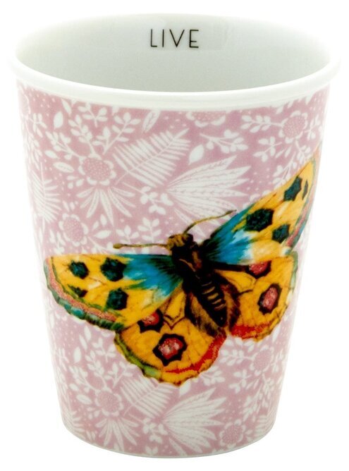 Koppens form är klassisk och cylindrisk, vilket gör den både praktisk och estetiskt tilltalande. Materialet i porslin bidrar till en hållbar och slitstark känsla. Inuti koppen finner man ordet "LIVE" tryckt i svart, vilket kan fungera som en påminnelse om att njuta av varje ögonblick medan man avnjuter sin dryck.