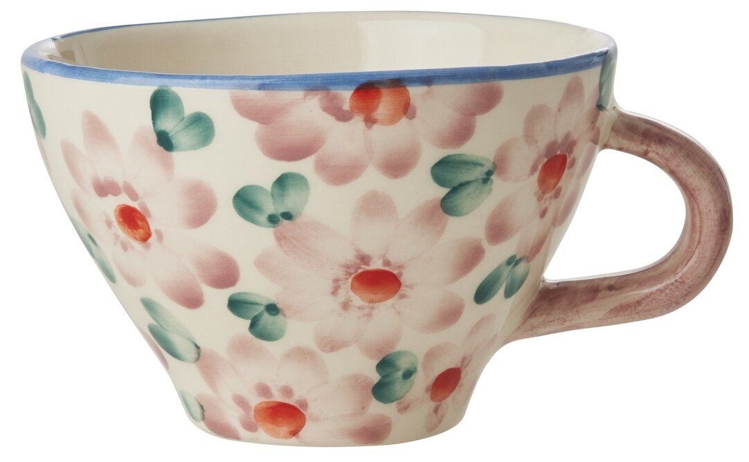 Låt varje tepaus bli något att se fram emot med denna underbara tekopp, vars blomstrande mönster och mjuka färgtoner sprider glädje vid första ögonkastet. Tillverkad för hand i Portugal, vilket gör varje kopp helt unik – en hyllning till hantverk, kvalitet och skönhet i vardagen.
