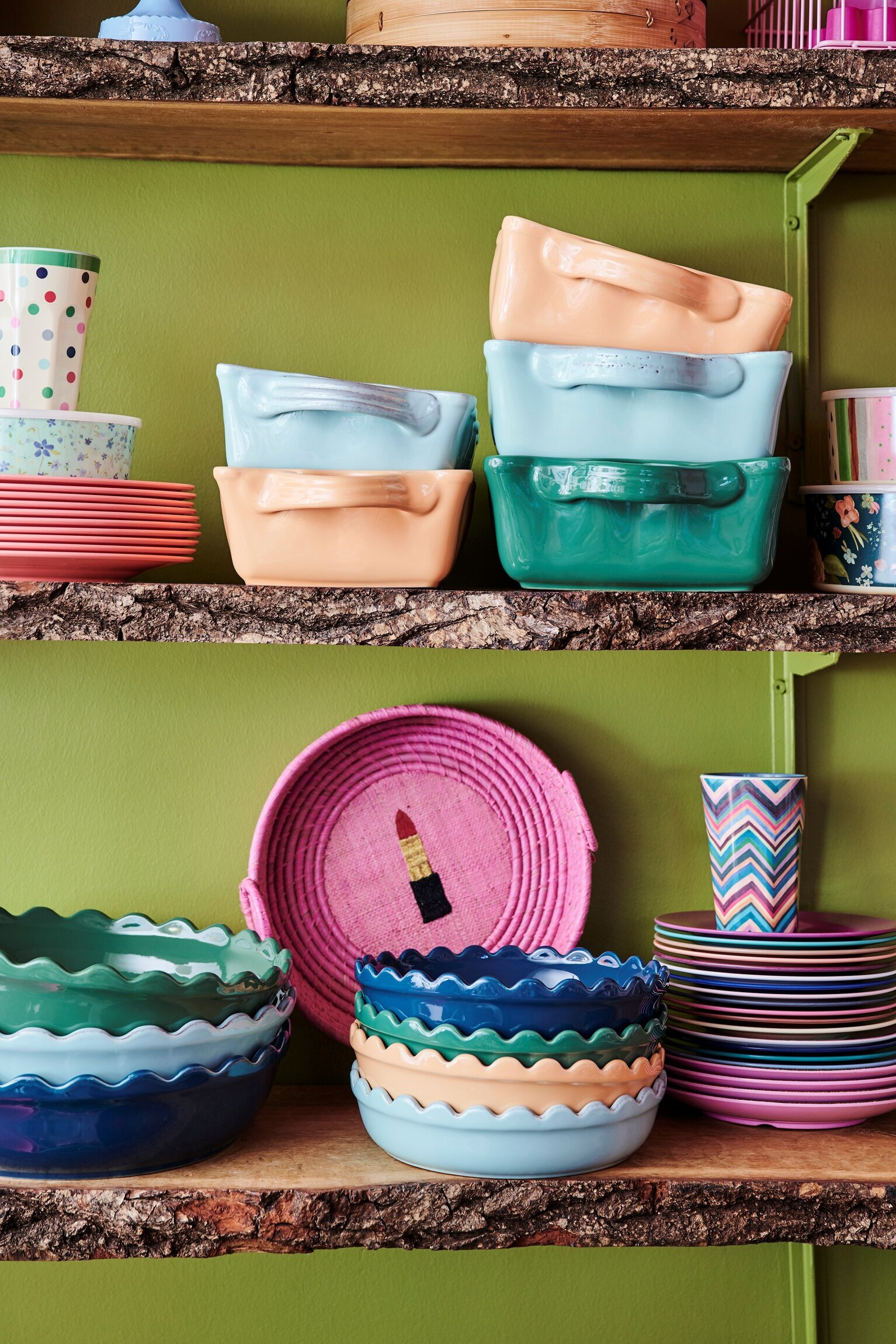 I mitten av hyllan vilar fler keramikprodukter, däribland en rad formskålar med vågiga kanter. Skålarna, som är i olika nyanser av blått, grönt och aprikos, är placerade ovanpå varandra i en perfekt symmetri. Varje skåls vågiga kant skapar ett visuellt lekfullt uttryck och tillför en nästan konstnärlig aspekt till hyllan.