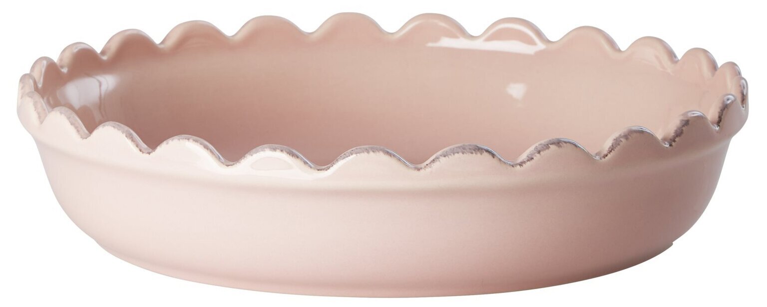 Materialet ger ifrån sig en något glansig yta, vilket indikerar att formen kan vara glaserad, det skyddar ofta keramik och förstärker dess hållbarhet. Denna glasyr reflekterar ljuset på ett sätt som skapar en fin lyster över den rosa ytan. Förutom sin estetiska kvalitet, är ytan troligen också användbar för att underlätta rengöringen efter gräddning av pajer och andra bakverk.