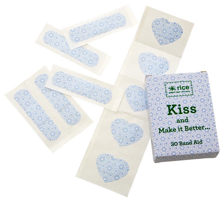 Förpackningen som medföljer är placerad till höger på bilden. Den är rektangulär med samma blåa, blommiga mönster som återkommer på plåstren. På framsidan av förpackningen finns texten "Kiss and Make it Better", vilket adderar en känsla av omtanke och omsorg till produkten. Det antyder att plåstren inte bara är praktiska utan även designade med en tanke på att trösta och inge trygghet.