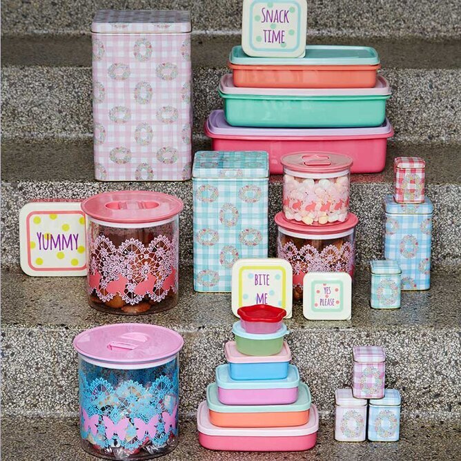 I mittsektionen märks särskilt de burkar som är dekorerade med blommiga och spetslika mönster. Dessa burkar har runda lock och genomskinliga sidor, vilket gör dem perfekta för att visa innehållet. Några har inskriptioner som "Snack Time", "Yummy", och "Bite Me" tryckta i lekfulla typsnitt på deras lock, vilket förstärker det vänliga och öppna intrycket.