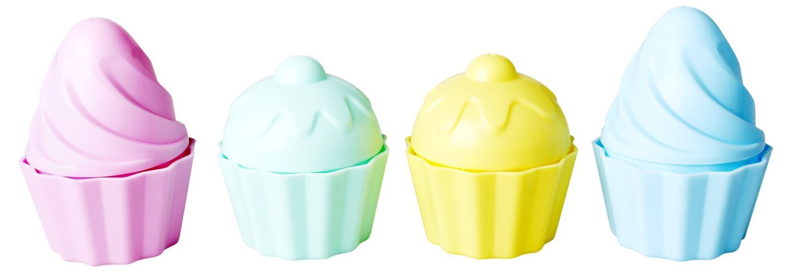 Bilden från Köpstaden.se visar ett uppsättning sandformar från varumärket Rice, kallade Sandformar Cupcakes. På bilden ser vi fyra olika formar som representerar olika varianter av cupcakes. Varje form är utformad med tydliga detaljer som fångar ögat, var och en i en unik färg som ger en känsla av lekfullhet och mångfald.
