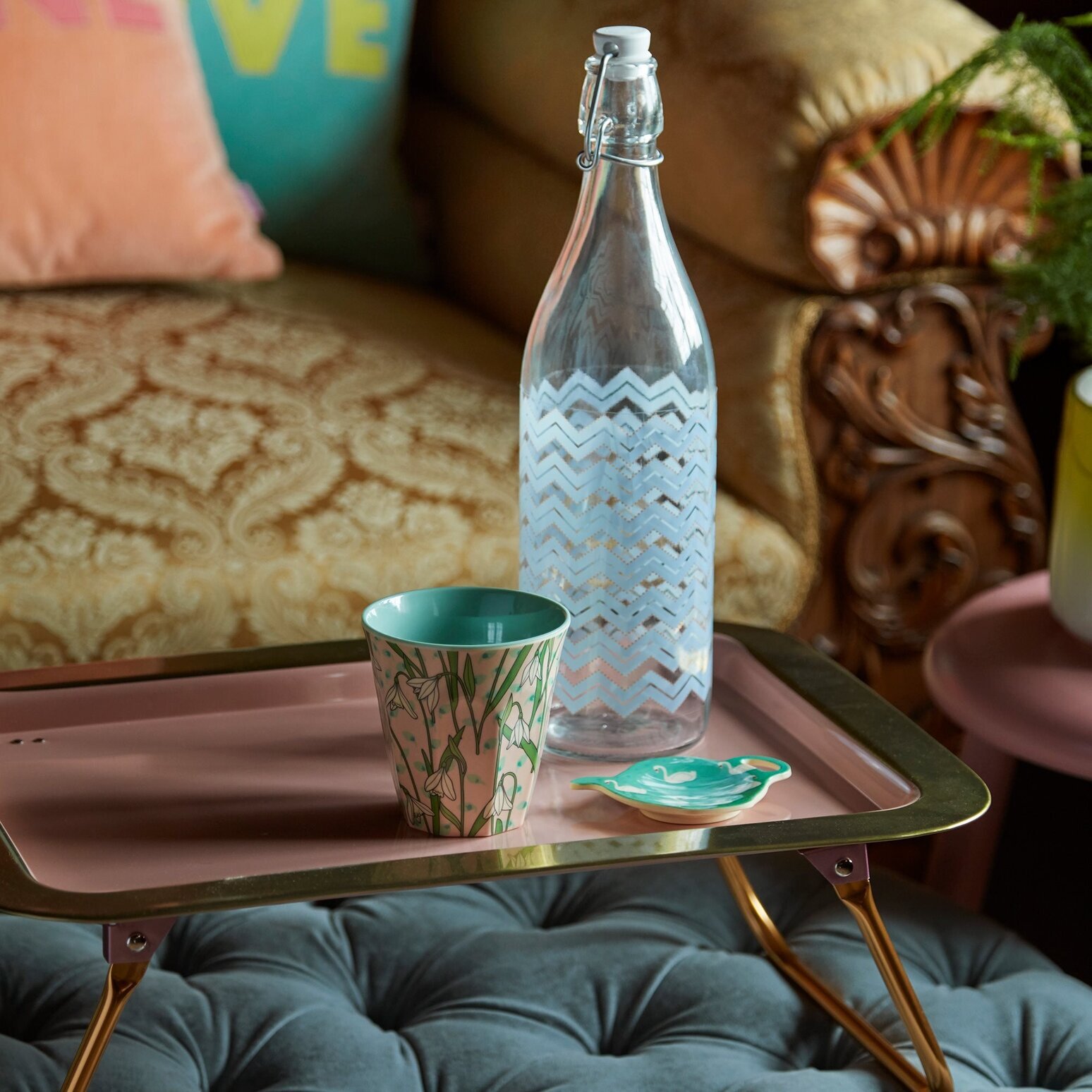 På ytan av sängbrickan står en stilren glasflaska med ett diagonalt sicksackmönster i vitt, vilket ger en modern touch och kompletterar färgkombinationerna. Bredvid flaskan finns en dekorativ kopp, som bär ett subtilt blommönster i vitt och grönt mot en bakgrund av ljus rosa. Koppen ger intrycket av att vara både praktisk och estetiskt tilltalande, en perfekt följeslagare vid lugna stunder.