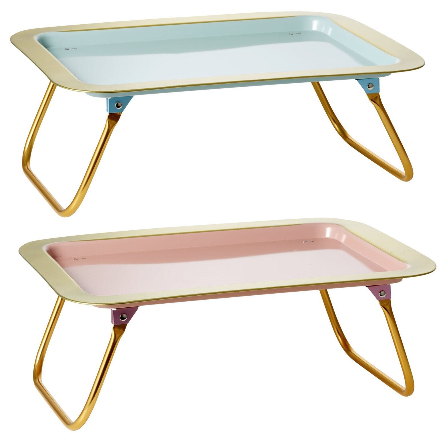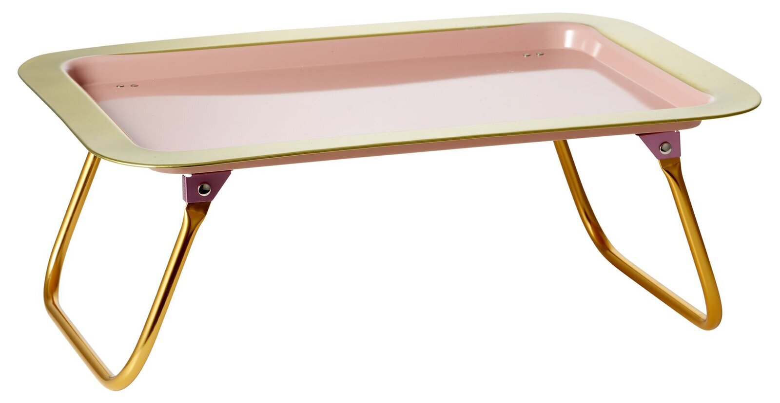 Sängbricka, rosa med gulddetaljer samt vikbara ben. Finns i 2 olika färgkombinationer. Mått: 44 x 32 x 16 cm.
