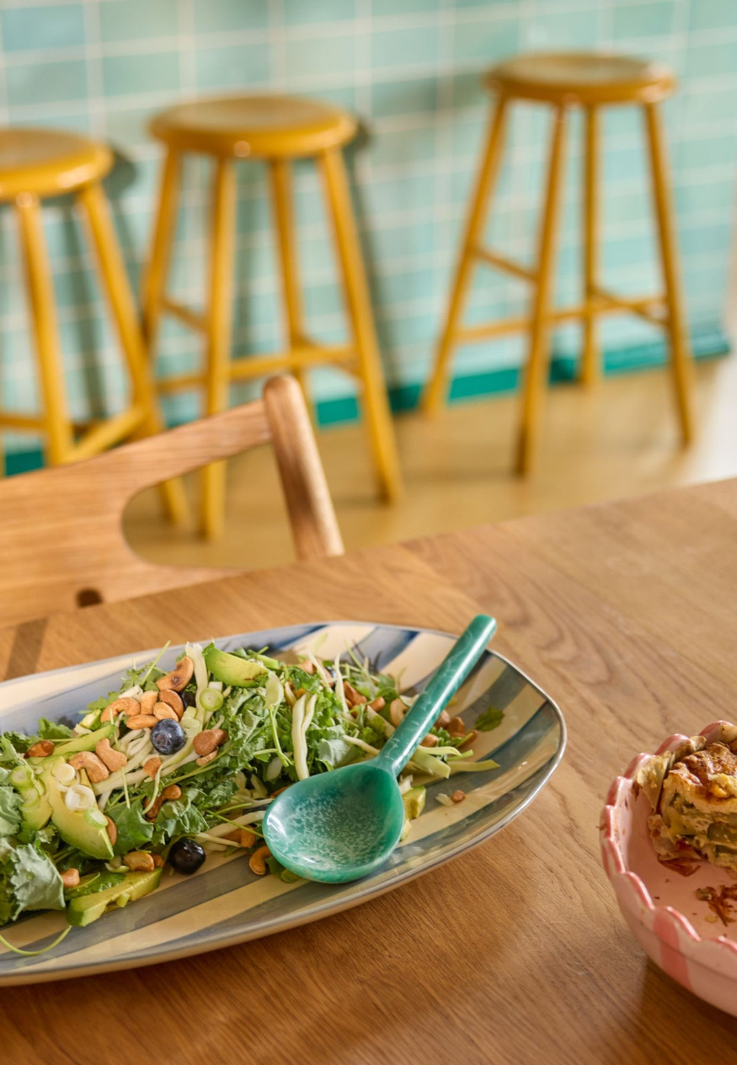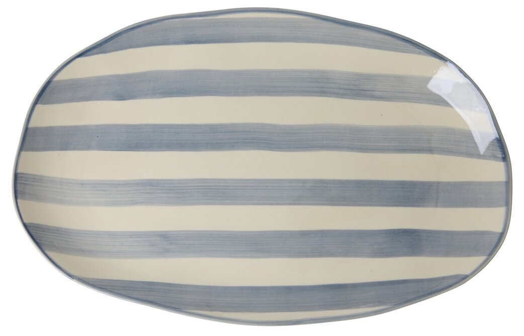 Serveringsfat i glaserat stengods med handmålad randig dekor i blått. Den organiska formen och de mjuka penseldragen ger ett levande uttryck som passar lika fint till vardag som till fest. Perfekt för att duka upp sallader, frukt, bröd eller förrätter – men också för servering av uppskivat kött, kyckling, lax eller andra varma rätter.