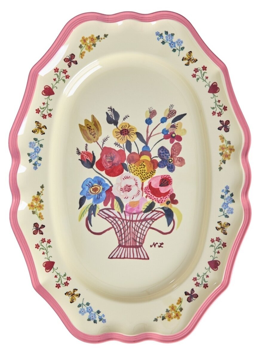 Detta vackra serveringsfat från Rice, skapat i samarbete med den franska konstnären Nathalie Lété, blir en underbar mittpunkt på din dukning. Med ett färgsprakande blommotiv och romantiska detaljer som fjärilar och rosetter, utstrålar det både charm och elegans.