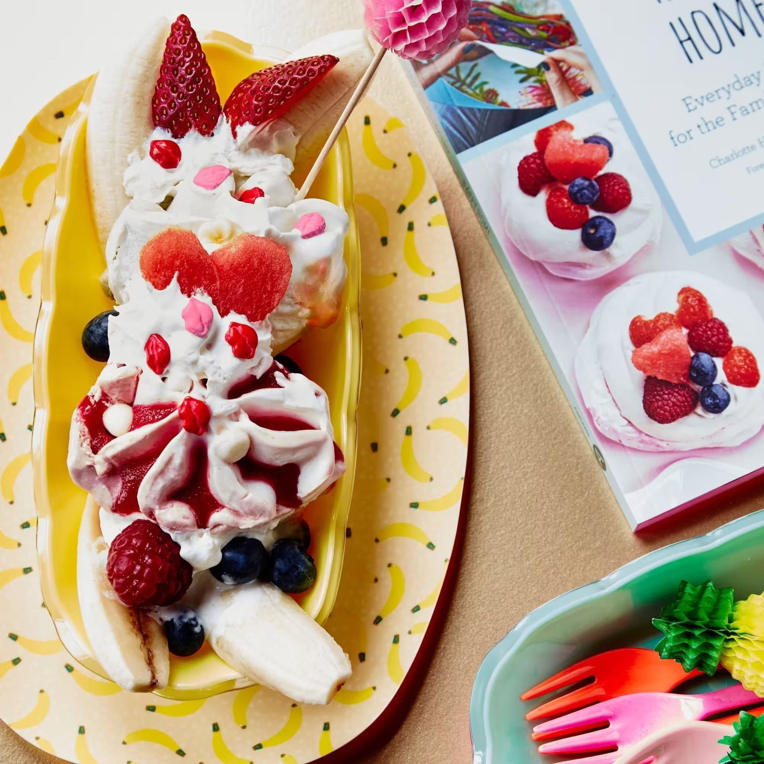 Skålen är placerad på ett ovalt fat med bananmönster, vilket knyter an till temat och förstärker den övergripande presentationen. Fatets ljusgula färg pryder sig med små, rena illustrationer av bananer som vrider sig lekfullt runt ytan, vilket ger ett roligt och charmigt inslag.