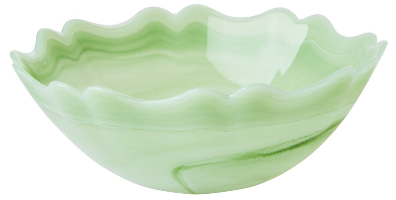 Glasskål i en fin grön nyans med vågig dekorkant, en fin detalj till det dukade bordet. Från Rice.