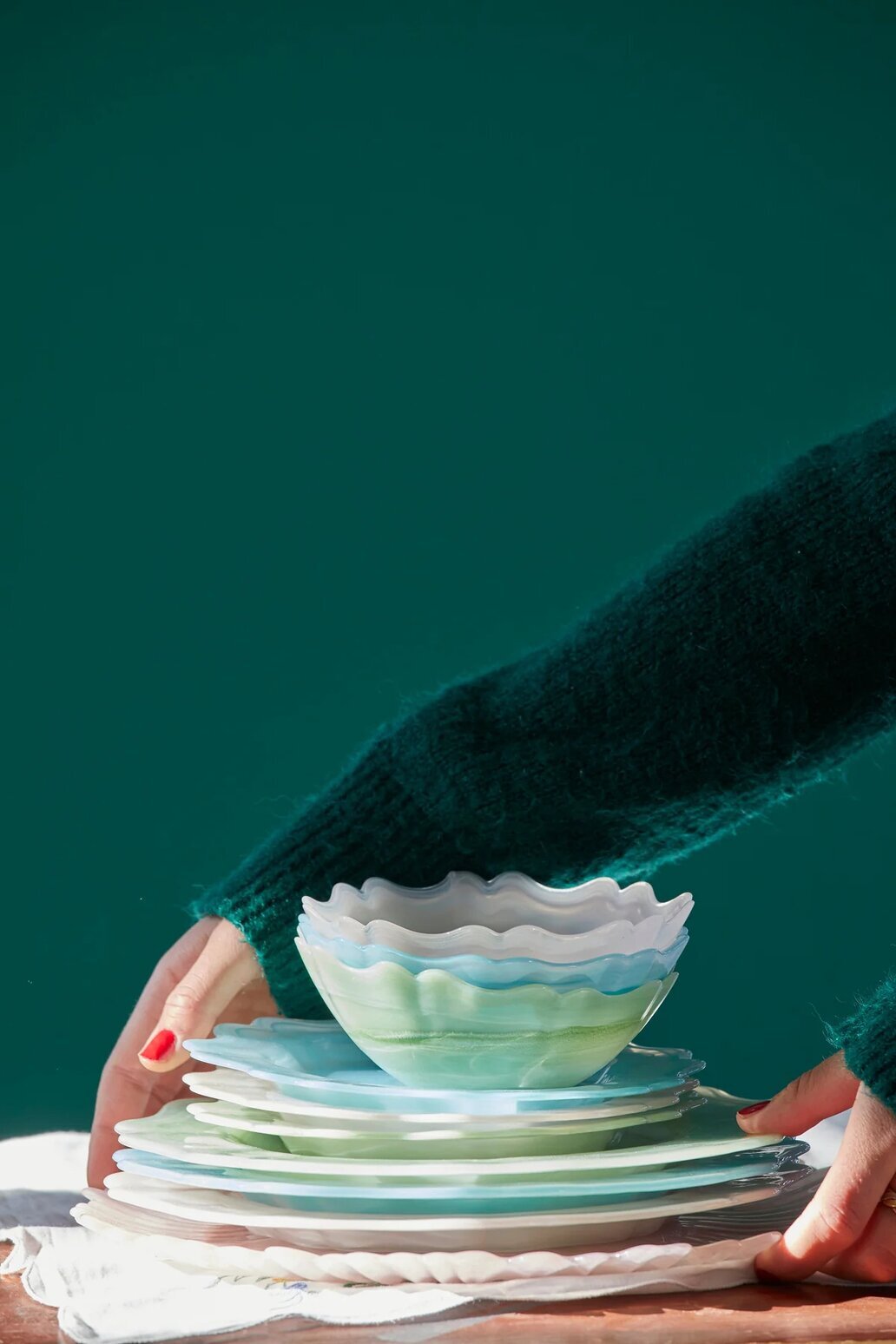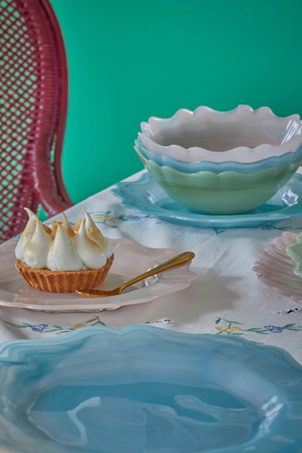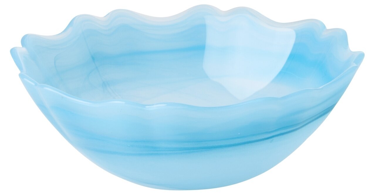 Glasskål i en fin blå nyans med vågig dekorkant, en fin detalj till det dukade bordet. Från Rice.