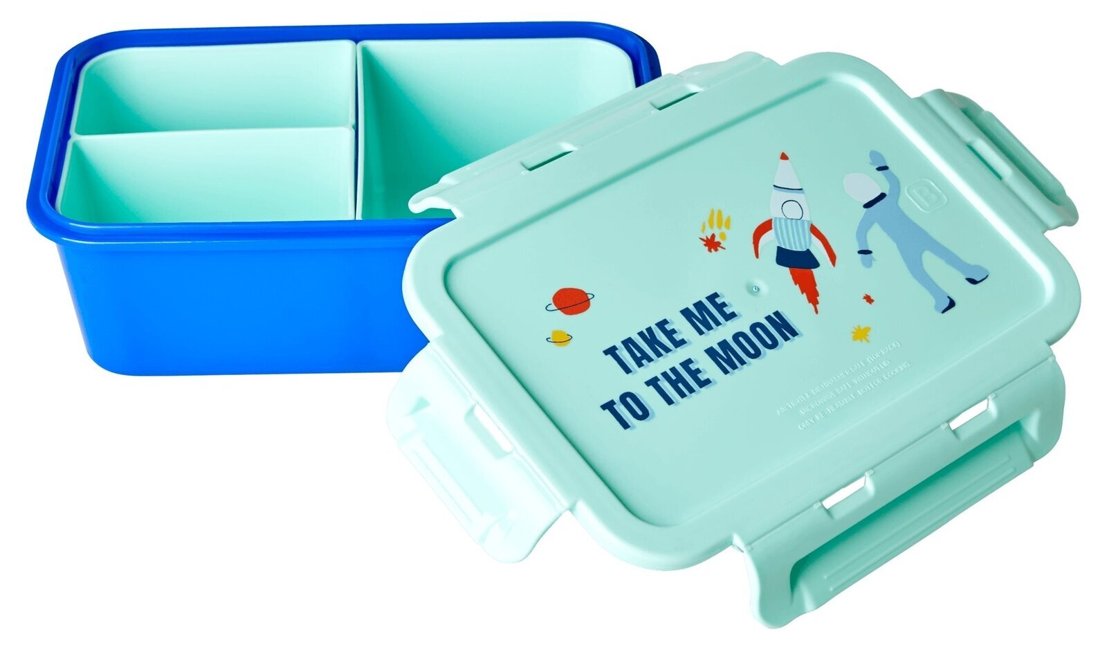 Bilden visar en lunchlåda från varumärket Rice, tillgänglig på Köpstaden.se. Denna lunchbox, kallad "Lunchbox Space Print", har ett rymdtema som är både lekfullt och inspirerande.