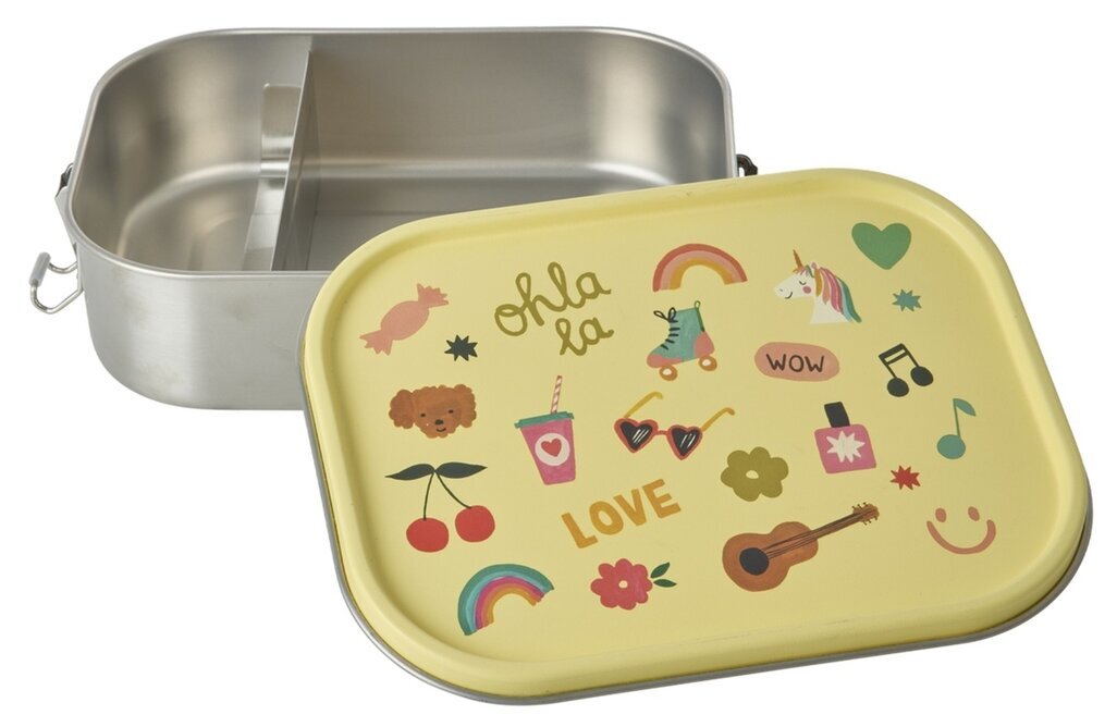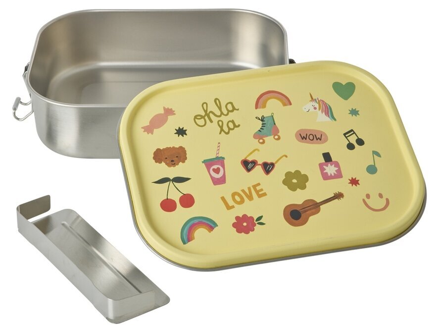 Gör måltiderna roligare med denna charmiga lunchlåda i rostfritt stål med färgglad dekor på locket. Den är både slitstark och praktisk, och har ett avtagbart fack som gör det enkelt att hålla maten åtskild. Perfekt för smörgåsar, frukt, snacks eller annan kall mat.