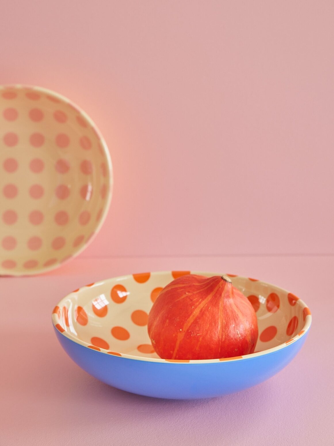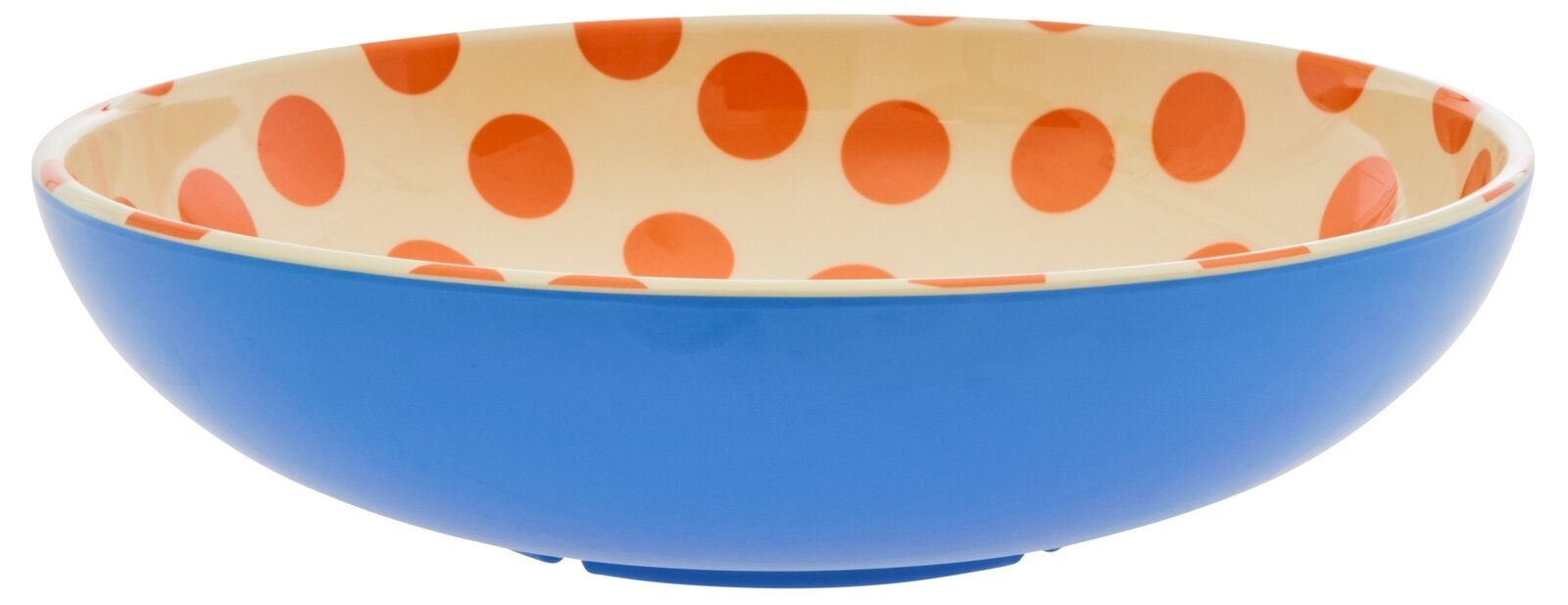 Stor & rejäl salladsskål med orangea prickar, en fin detalj till det dukade bordet. Från Rice.