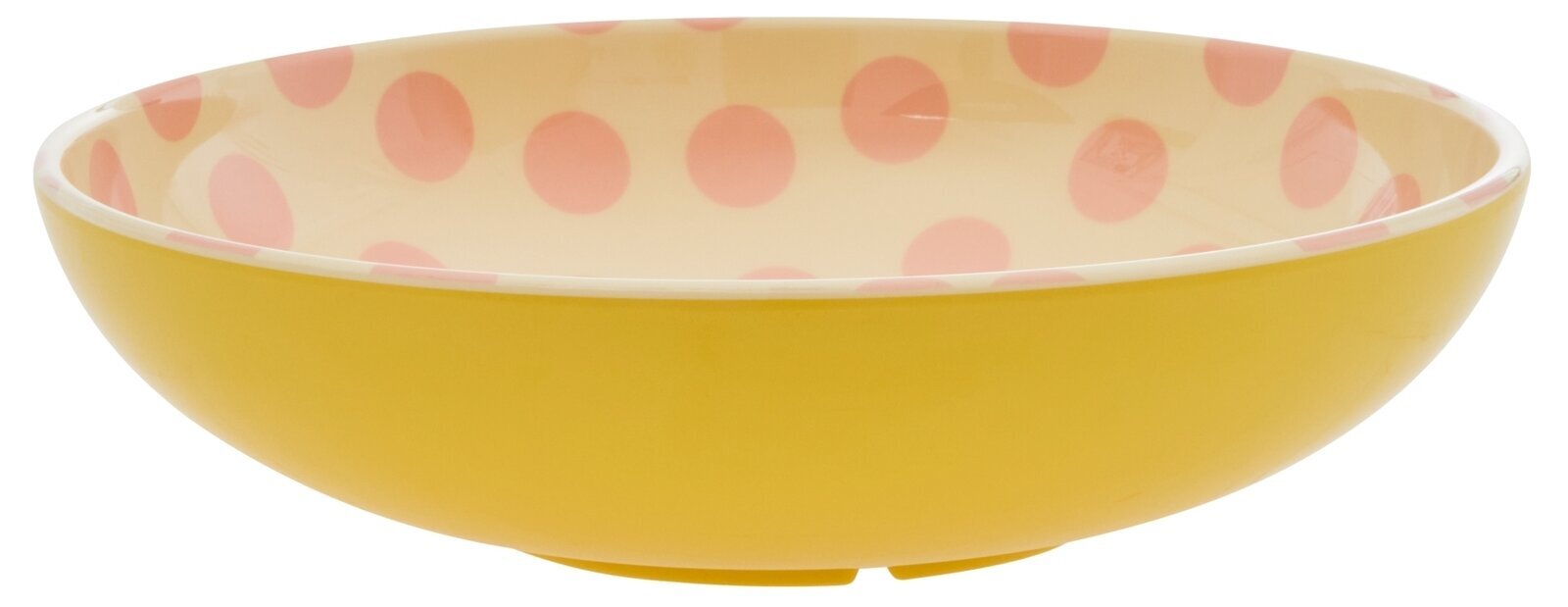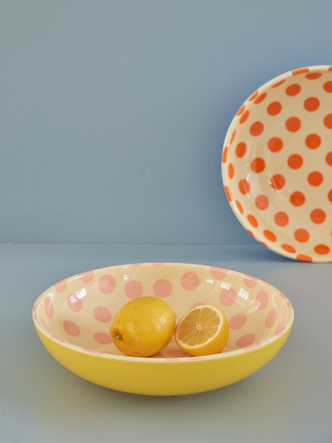 Stor & rejäl salladsskål med ljusrosa prickar, en fin detalj till det dukade bordet. Från Rice.