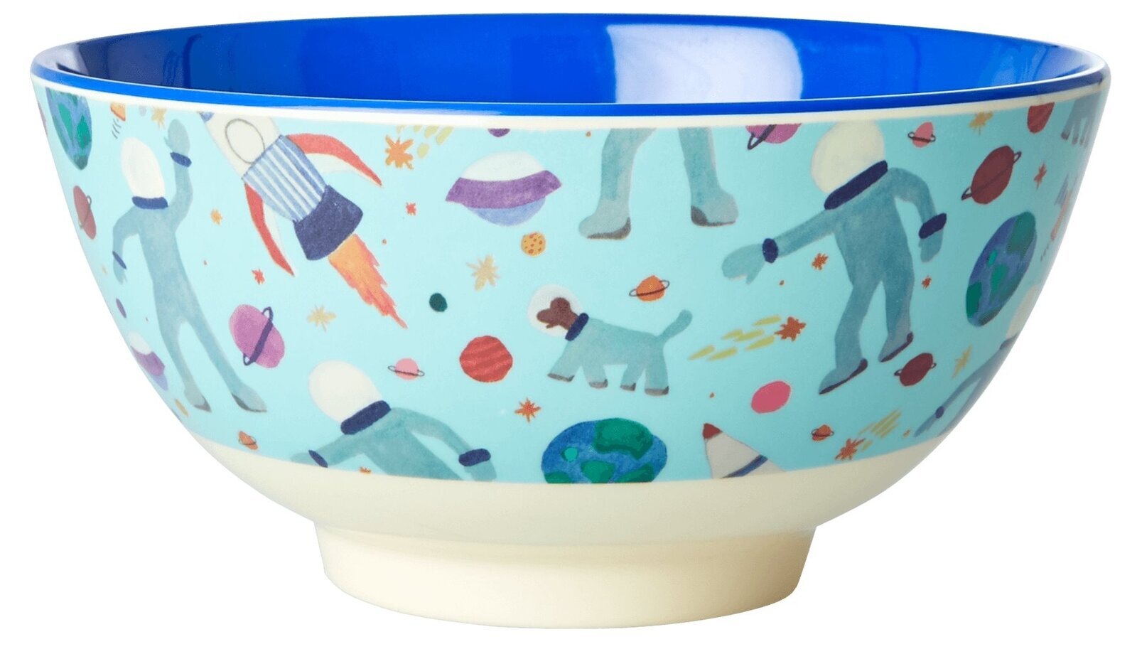 Den ljusblå bakgrunden på skålen bildar en härlig kontrast mot de många färgglada detaljerna. Vi kan se illustrerade figurer föreställande astronauter, vilket ger en känsla av äventyr och utforskning. Dessa figurer är spridda över hela ytan i olika ställningar som antyder rörelse och liv. Bredvid astronauterna finner man också motiv av raketer, olika planeter och stjärnor, som flyter runt och förstärker den himmelska tematiken.