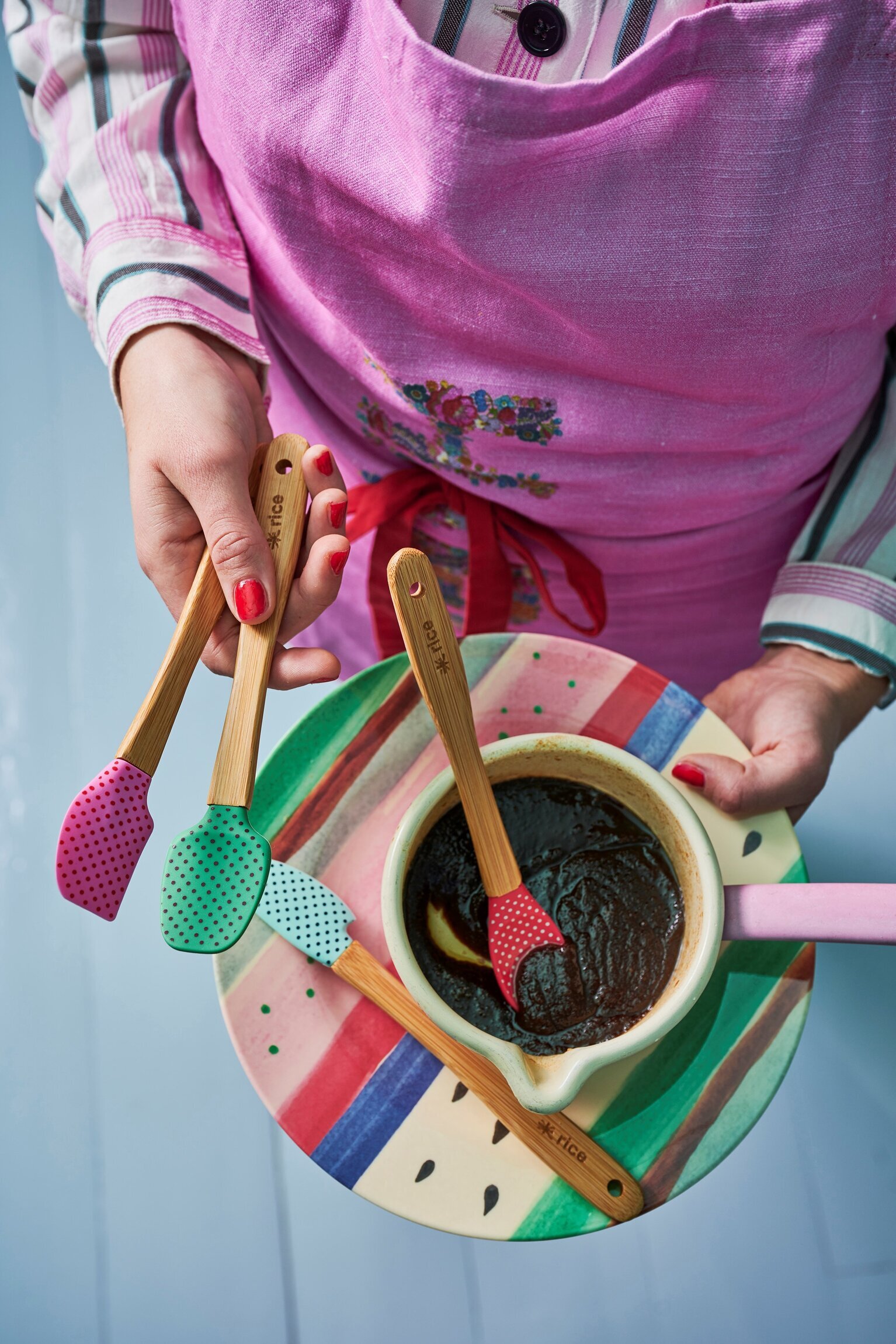 Förpackning innehållande 4 stycken slevar & slickepottar i silikon med bambuskaft. Silikonet klarar höga temperaturer samtidigt som de inte skrapar känsliga material och är därmed ett perfekt redskap i köket, både till bak- & matlagning.