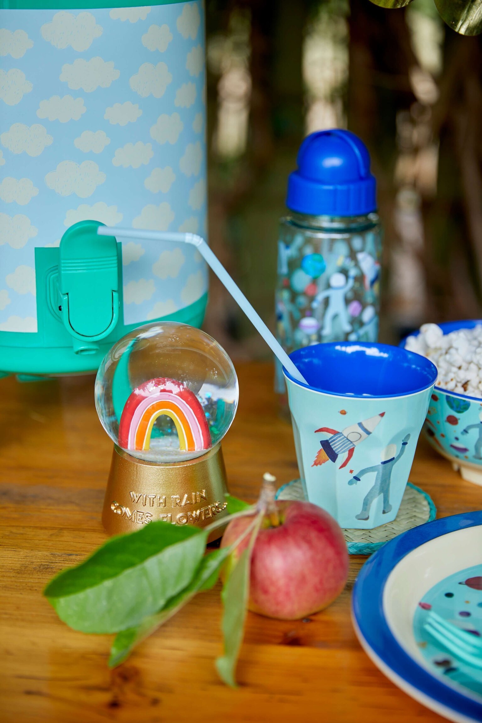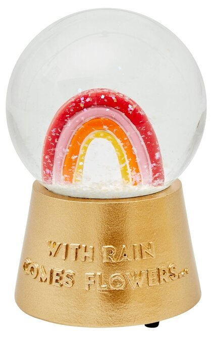 Guldfärgad snöglob från Rice med regnbågsdesign samt text - With rain comes flowers. Snögloben kan vridas upp undertill när man önskar lyssna på en liten trudelutt.