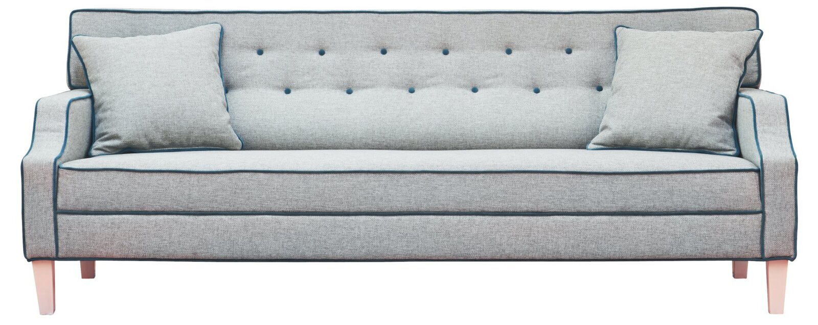 Klädseln i grått tyg ger ett mångsidigt utseende som enkelt kan matchas med olika typer av inredningar. De petrolfärgade kanterna ger en kontrasterande färgton som fungerar som en diskret men effektiv designdetalj. Denna färg är också genomtänkt applicerad runt två fyrkantiga dekorationskuddar som vilar på soffan, vilket bidrar till både utseende och funktionalitet.