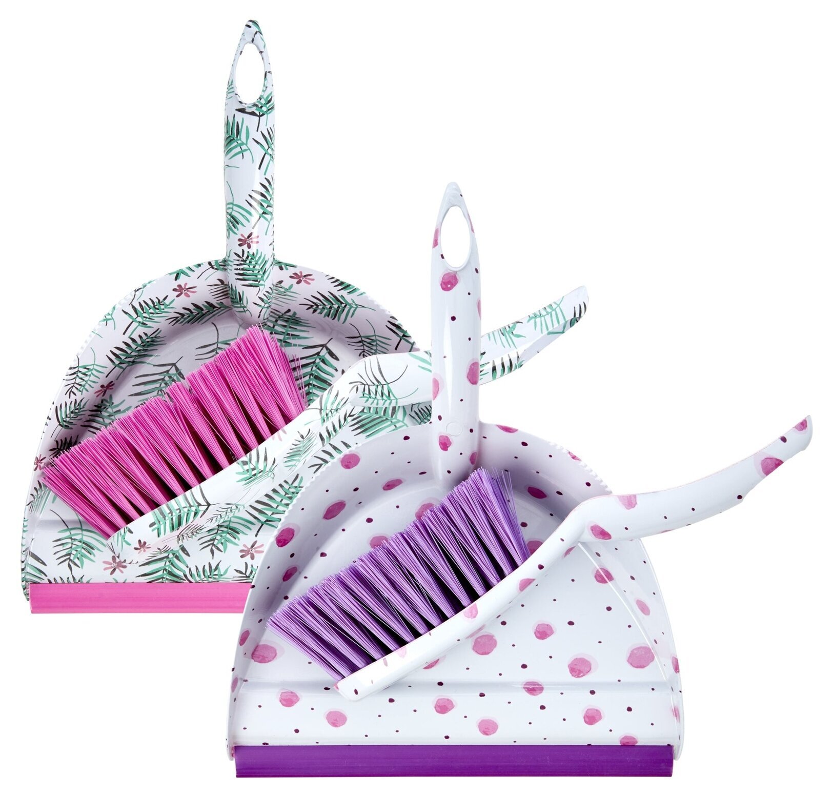 Det andra sopsetet tar en annan designriktning med en skyffel dekorerad med rosa och lila prickar i varierande storlekar mot en bakgrundsfärg av vitt. Borsten som följer med detta set har violetta borst, vilket harmonierar med prickarnas färgpalett. Handtaget återspeglar samma mönster av prickar, vilket förenar hela setet i en sammanhängande design.