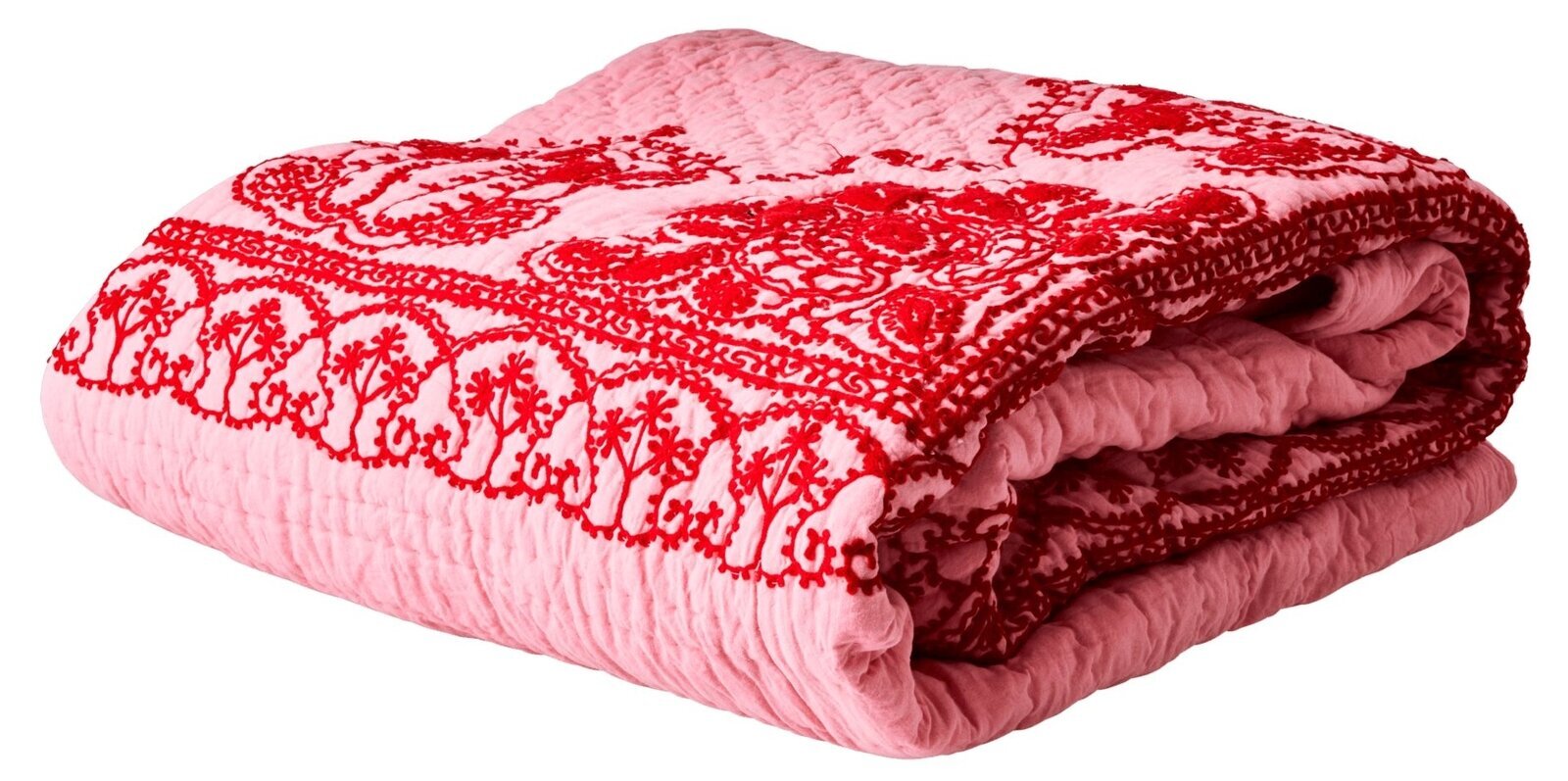 Vackert överkast i en fin rosa nyans med rött handbroderat mönster, storlek 250 x 225 cm . Från Rice. Läs mer