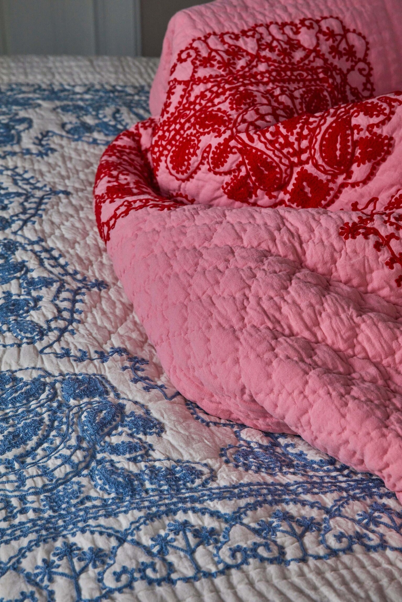 Vackert stort överkast i en fin rosa nyans med rött handbroderat mönster, en fin detalj i sovrummet eller till soffan. Överkastet kan tvättas i 30 grader men ska ej torktumlas.