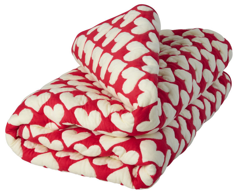 En mjuk och inbjudande bomullspläd som snabbt blir en favorit i hemmet. Det lekfulla mönstret med hjärtan i rött och naturvitt ger en varm och personlig känsla, samtidigt som uttrycket känns både modernt och tidlöst.