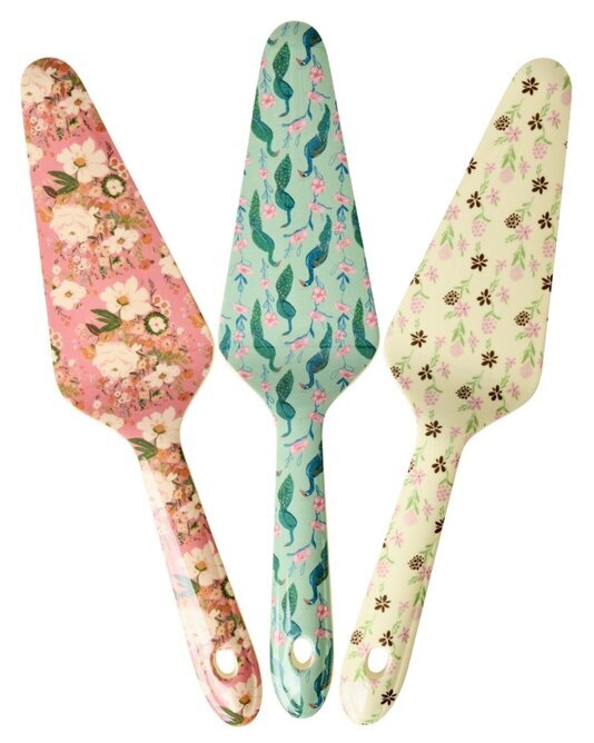 Bilden visar tre tårtspadar från Rice, utlagda sida vid sida mot en vit bakgrund. Dessa serveringsredskap återfinns hos Köpstaden.se, en butik som riktar sig till dem som söker praktiska och dekorativa hushållsartiklar för vardagsbruk. Tårtspadarna är tillverkade av ett tåligt material, troligen melamin, vilket gör dem lätta att hantera och underhålla i köket.
