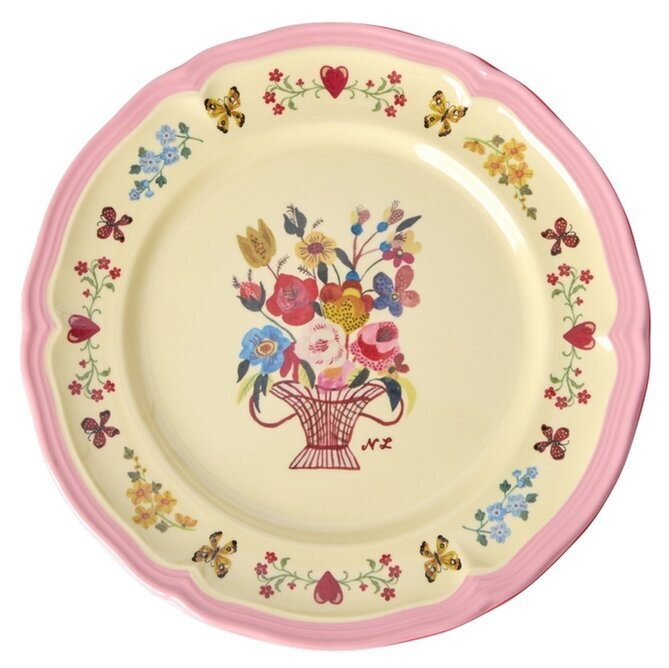 Denna vackra melamintallrik från Rice, designad i samarbete med den franska konstnären Nathalie Lété, ger dukningen en drömsk och romantisk känsla. Den livfulla blomsterbuketten i mitten, omgiven av detaljerade fjärilar & små blommor, skapar en tidlös och färgglad design.