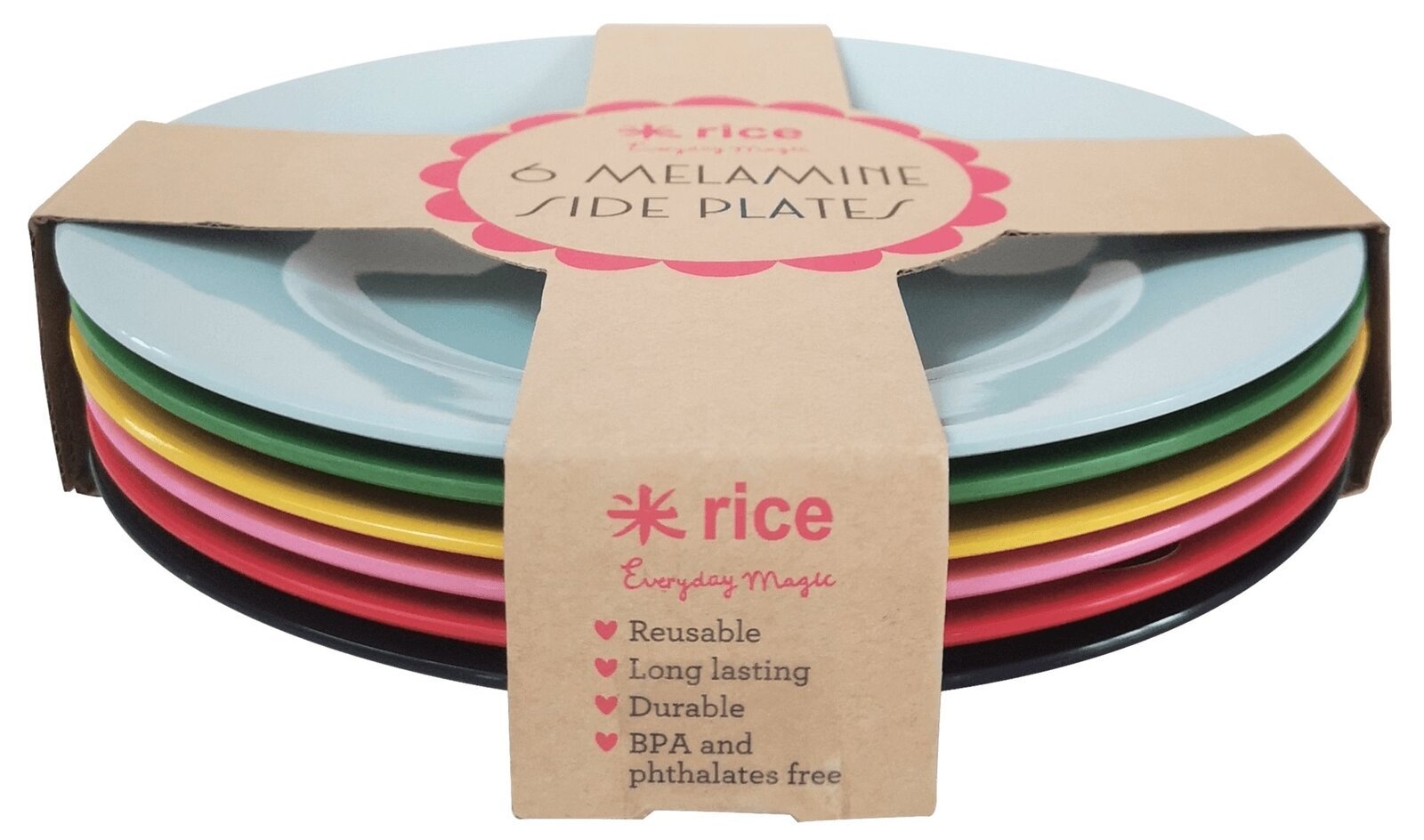 Bilden visar en produkt från Köpstaden.se, en mångsidig butik som erbjuder ett brett sortiment för alla vardagsbehov. Produkterna på bilden är ett set av sex assietter från varumärket Rice, som tydligt syns staplade på ett estetiskt tilltalande sätt. Varje tallrik är tillverkad i livfull melamin och de finns i sex olika färger, vilket gör dem lämpliga för att lysa upp varje måltid.