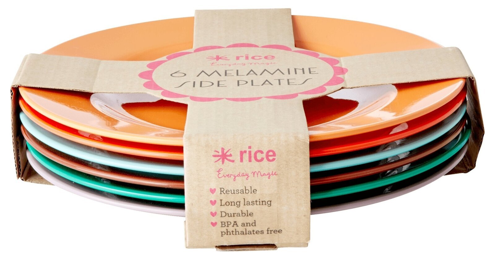 Set om 6 stycken assietter i slitstark & tålig melamin, härligt färgglatt som passar både till fest som vardag och de lämpar sig bra till förrätter, frukosttallrik, till barnens måltider mm.