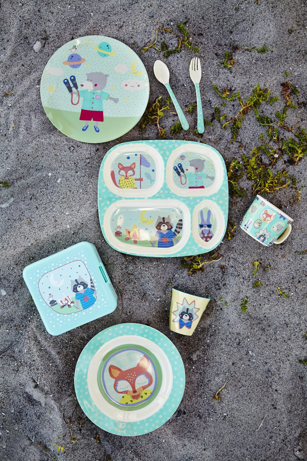 I mitten av kompositionen finns en delad tallrik med fyra sektioner, dekorerad med glada djurillustrationer. Varje sektion visar olika scener där figurer som en räv och en kanin har sällskap av en tvättbjörn i olika små äventyr. Färgpaletten går i pastelltoner, med ljusgrönt som dominerande bakgrund, vilket harmonierar fint med det naturliga temat runtomkring.