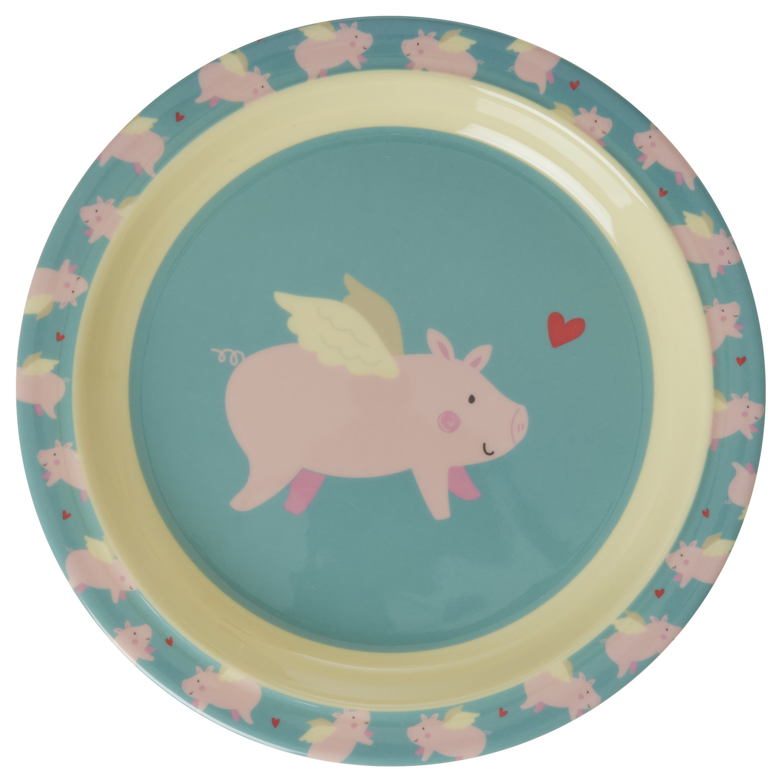 Tallrikens bakgrund är i en mjuk blågrön färg, vilket kontrasterar vackert mot den rosa grisen. Runt kanten på tallriken löper en gul rand som bildar en subtil gräns, och runt den yttre kanten finns en rad av små grisillustrationer. Dessa grisar är liknande i design till den större centrala bilden och har också små gula vingar. Detta mönster upprepas jämnt och skapar en känsla av symmetri och harmoni.