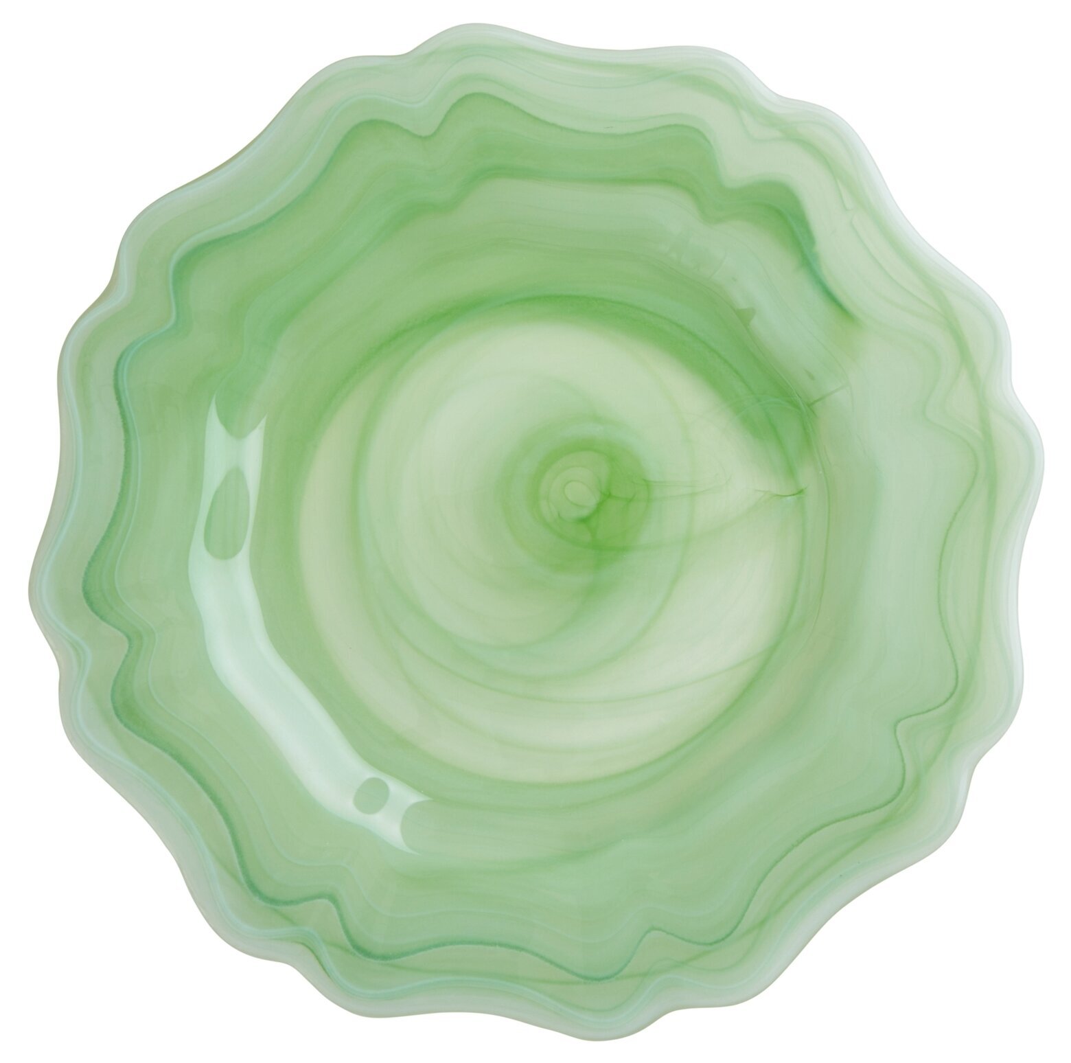 Glastallrik i en fin grön nyans med vågig dekorkant, en fin detalj till det dukade bordet. Från Rice.