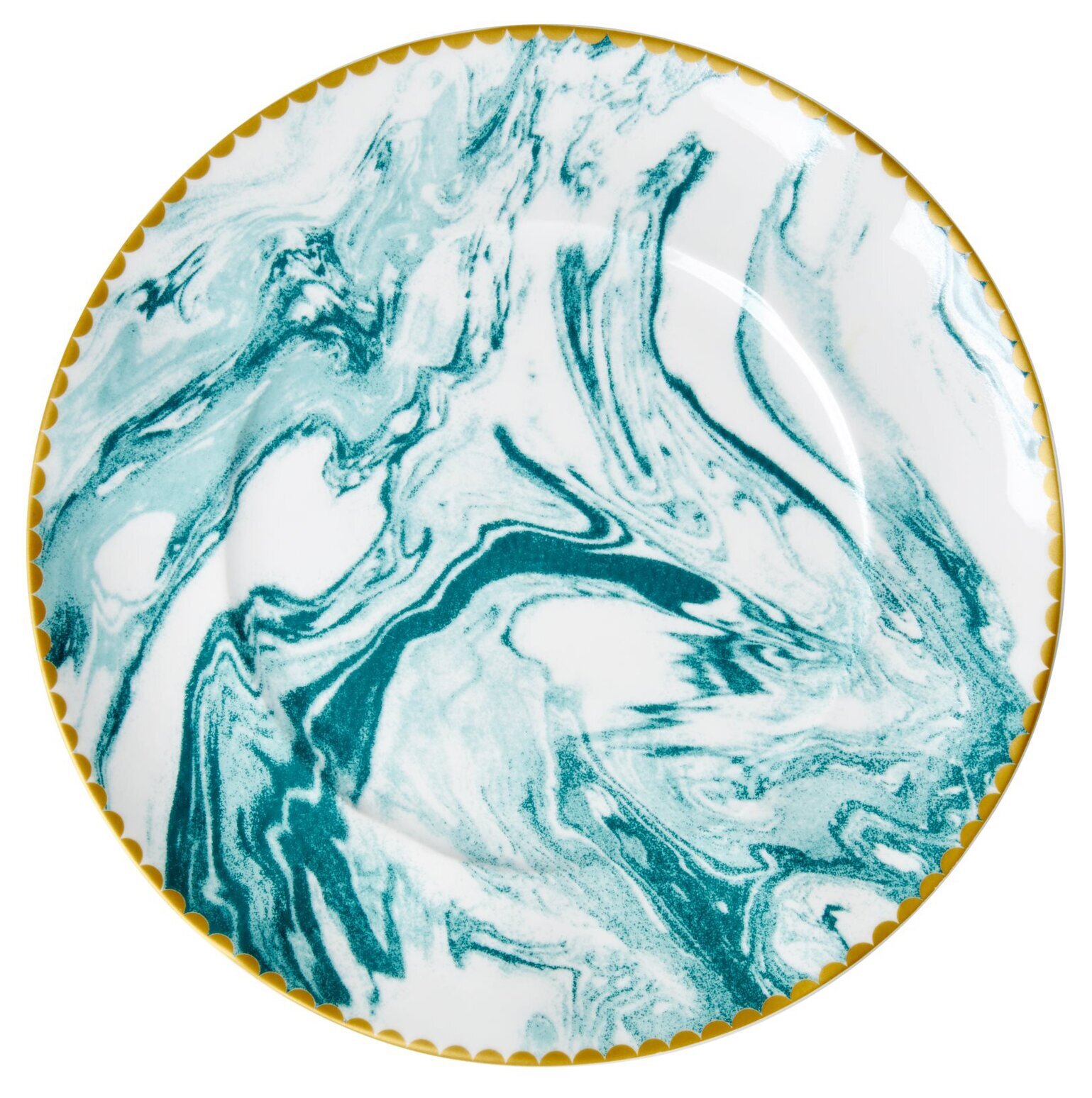Kanten av tallriken är dekorerad med en subtil kantslinga i gyllene färg, vilket tillför en extra dimension av detaljrikedom. Denna detalj inramar marmormönstret och ger hela designen ett harmoniskt avslut. Färgsättningen med de djupa gröna tonerna kontrasterar vackert mot det ljusa underlaget, vilket gör att motivet framträder klart och tydligt.