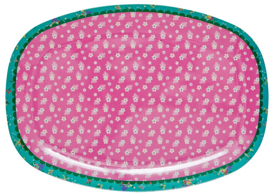 Tallriken har en rektangulär form med mjukt rundade hörn, vilket ger den en behaglig och lättillgänglig form. Den yttre kanten av tallriken står i kontrast till den rosa bakgrunden, med en djupgrön färg prydd med större blommor och subtila bladmotiv. Detta kantmönster ger tallriken en extra dimension och gör den till ett iögonfallande element på middagsbordet.