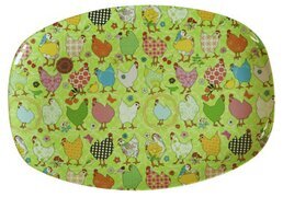 På bilden syns en färgglad och livfull melamintallrik från varumärket Rice, och den finns tillgänglig på Köpstaden.se. Denna tallrik är rektangulär till formen med något rundade kanter, vilket ger den ett mjukt intryck. Basfärgen är en ljus och behaglig grön, som skapar en harmonisk bakgrund för det detaljerade motivet som pryder hela ytan.