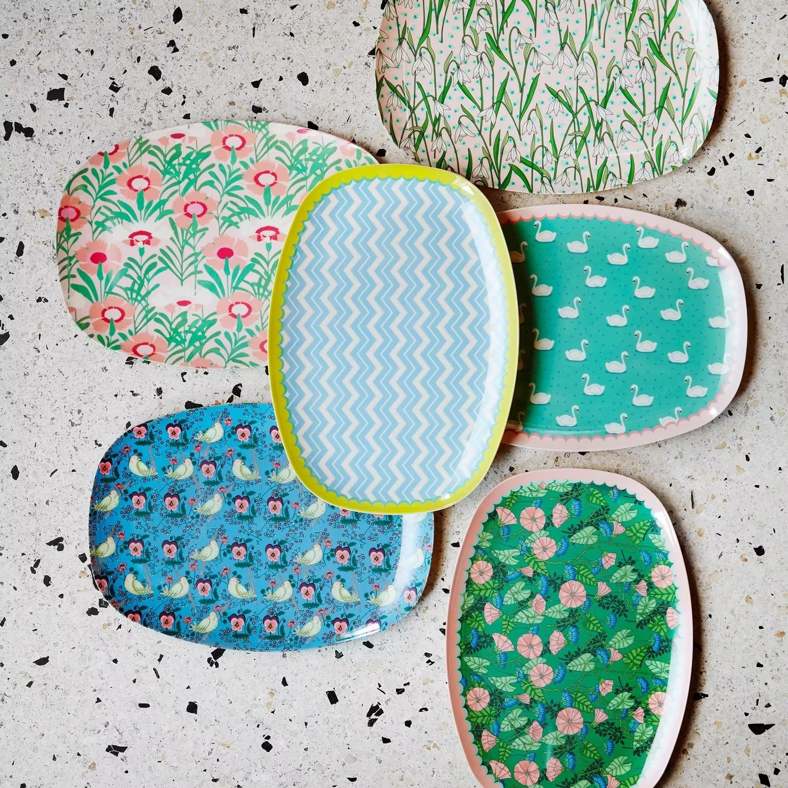 Till höger om sicksacktallriken ligger en tallrik dekorerad med små, stiliserade vita svanar mot en turkos bakgrund. Svanarnas enkla men effektfulla utseende ger tallriken en elegant och tidlös karaktär passande för alla tillfällen. Nedanför denna ser vi en tallrik vars mönster består av ett tätt sammanflätat motiv av gröna blad och rosa blommor, vilket förstärker naturtemat ytterligare.