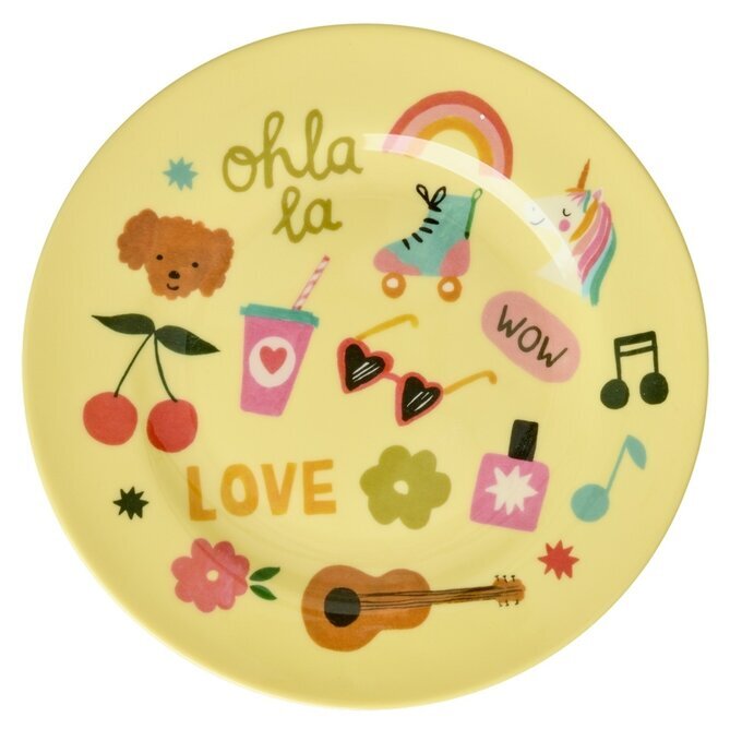 Underbar melamintallrik i solgul ton är fylld med charmiga illustrationer som får både stora och små att le. Med motiv som enhörningar, regnbågar, körsbär, hjärtformade solglasögon och ord som “LOVE” och “oh la la” blir varje frukost, fika eller mellis en fest.
